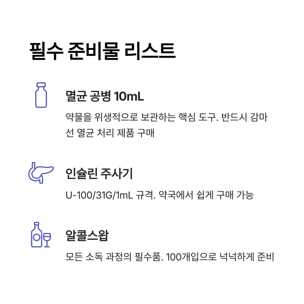 - 구매 팁: 100개입 박스로 넉넉하게 구매해두세요. 주사 전후 바이알 소독 시 아낌없이 사용해야 합니다.