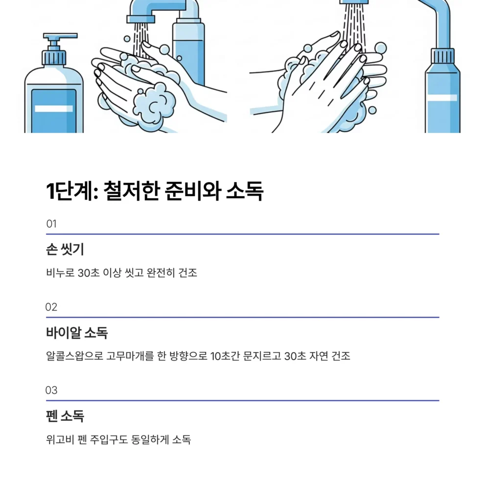가장 중요한 것은 멸균입니다. 모든 준비물은 절대 재사용하지 말고 매번 새것을 사용해야 합니다.