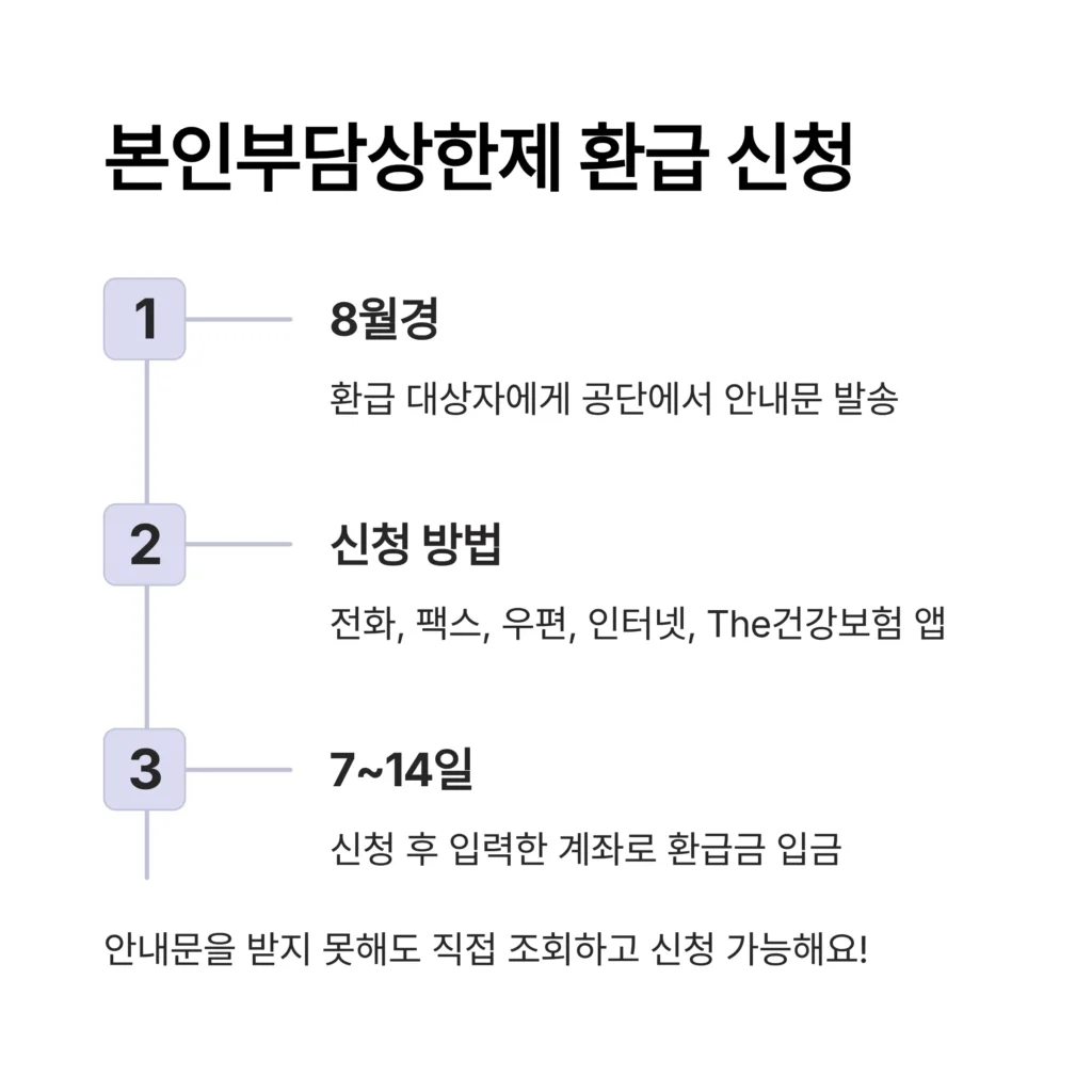 보통 매년 8월경, 환급 대상자에게 국민건강보험공단에서 지급 신청 안내문을 보내줘요. 안내문을 받았다면 전화, 팩스, 우편, 인터넷(공단 홈페이지) 또는 ‘The건강보험’ 앱을 통해 간단하게 신청할 수 있습니다. 신청 후 약 7~14일 내에 입력한 계좌로 환급금이 들어옵니다. 만약 안내문을 받지 못했더라도 공단 홈페이지나 앱에서 직접 조회하고 신청할 수 있으니 실망하지 마세요!