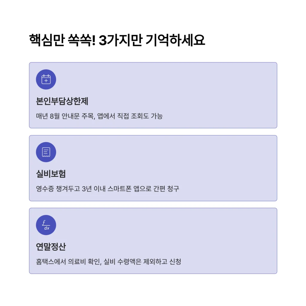 - 연말정산은 꼼꼼하게: 홈택스 연말정산 간소화 서비스를 통해 의료비 내역을 확인하고, 실비 보험금 수령액은 꼭 제외하고 공제 신청하세요.