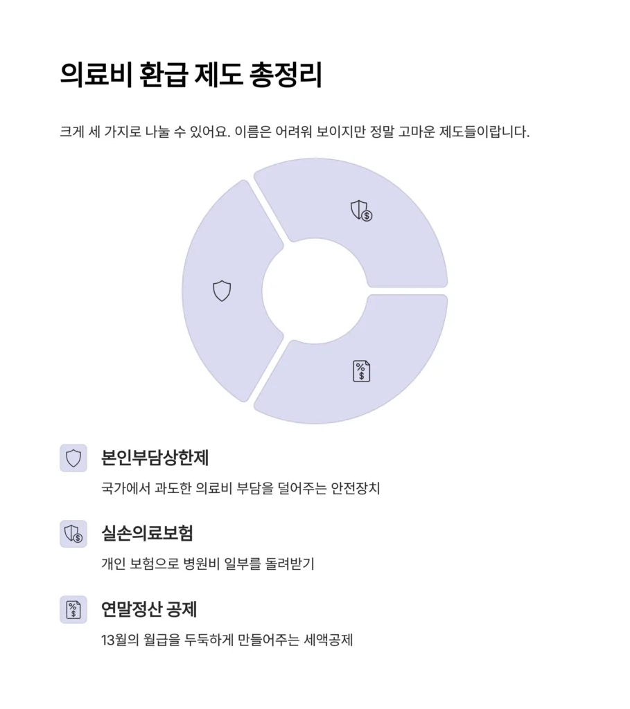 의료비 환급은 크게 세 가지로 나눌 수 있어요. 이름은 좀 어려워 보이지만, 알고 보면 정말 고마운 제도들이랍니다. 하나씩 쉽게 풀어드릴게요.