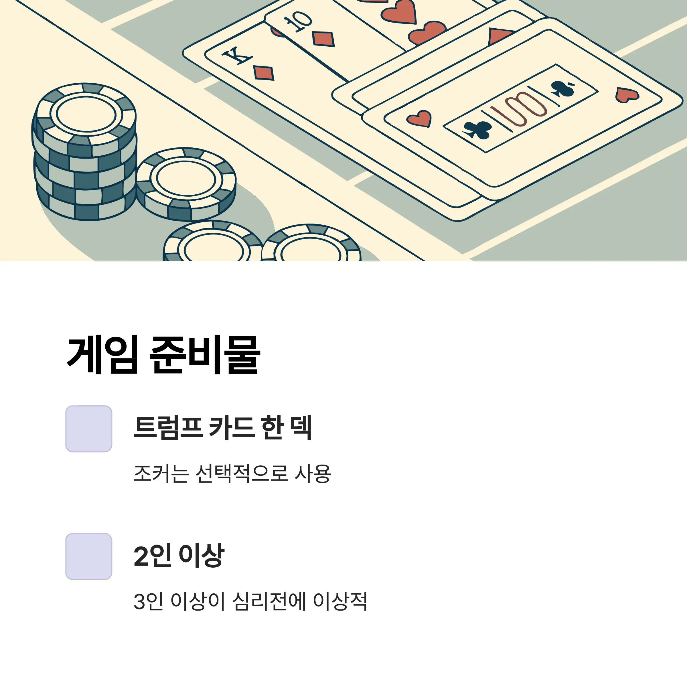 - 조커는 보통 사용하지 않지만, 게임의 재미를 위해 특별 규칙으로 활용할 수도 있습니다.