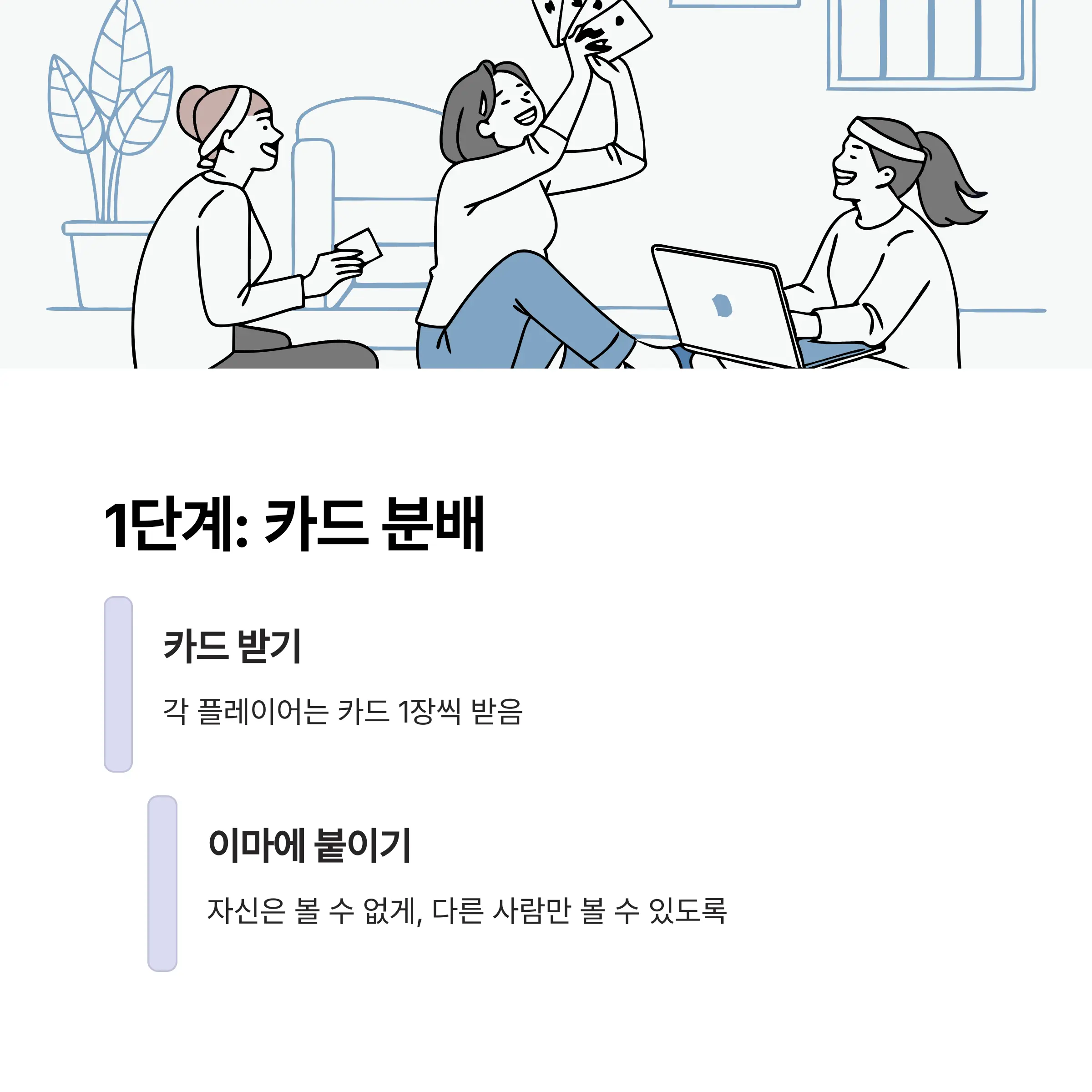 - 패 확인: 플레이어는 받은 카드를 자신의 이마에 붙이거나, 뒷면이 보이도록 들고 다른 플레이어들이 볼 수 있게 합니다. 자신은 절대로 자신의 패를 봐서는 안 됩니다.