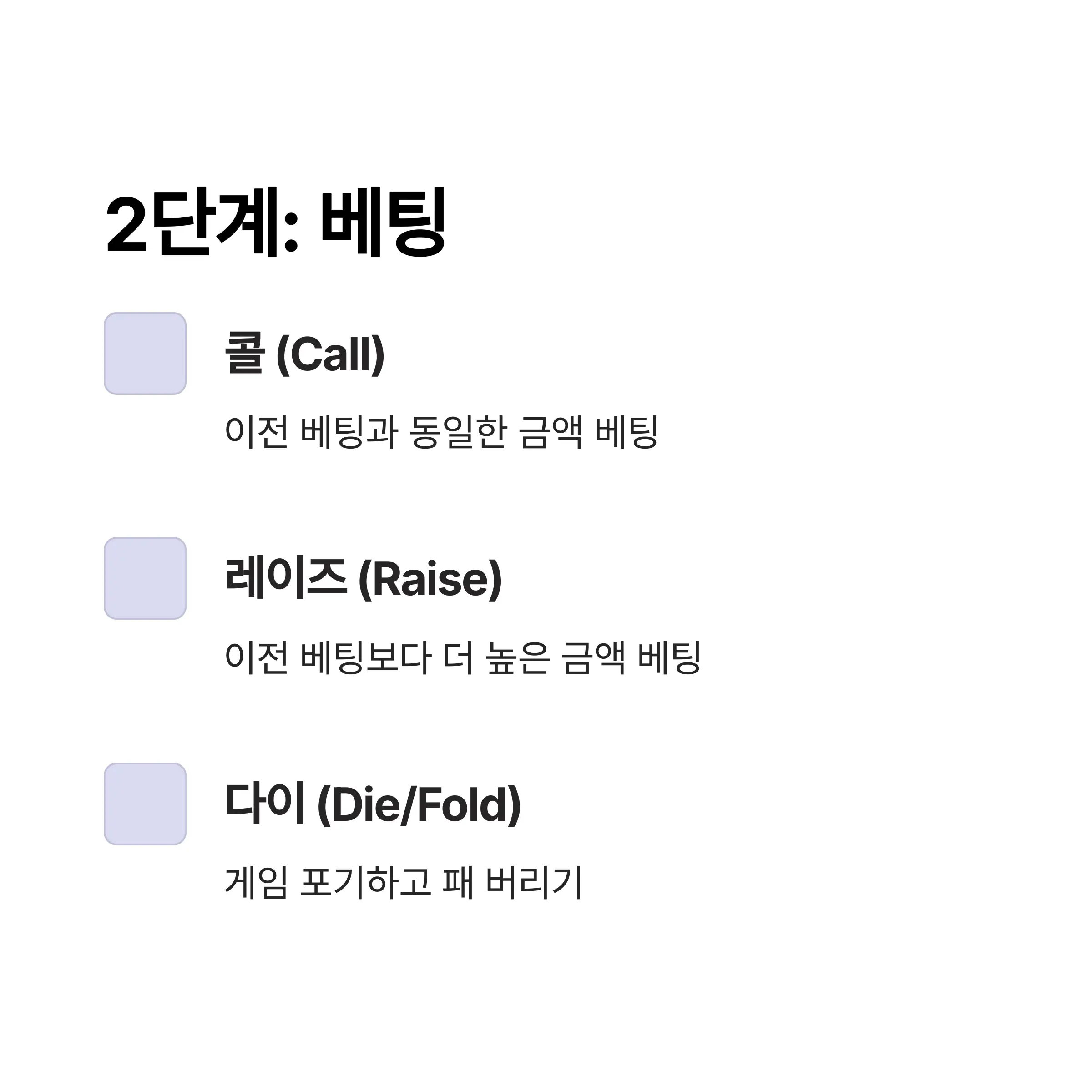 - 콜 (Call): 이전 플레이어가 베팅한 금액만큼 똑같이 걸고 다음 플레이어에게 차례를 넘깁니다.