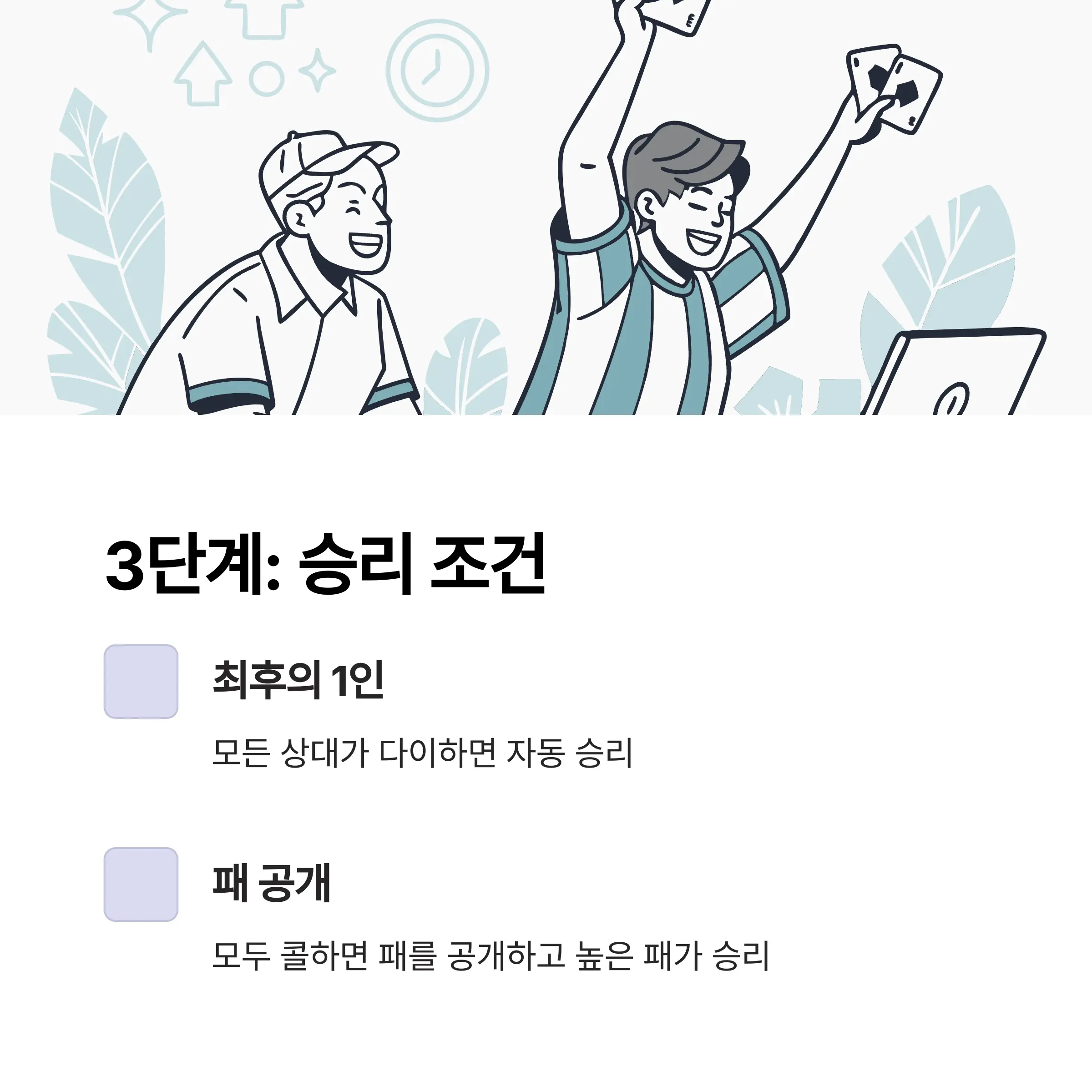 - 최후의 1인: 모든 플레이어가 ‘다이’하여 한 명의 플레이어만 남으면, 남은 플레이어가 어떤 패를 가지고 있든 자동적으로 승리합니다.