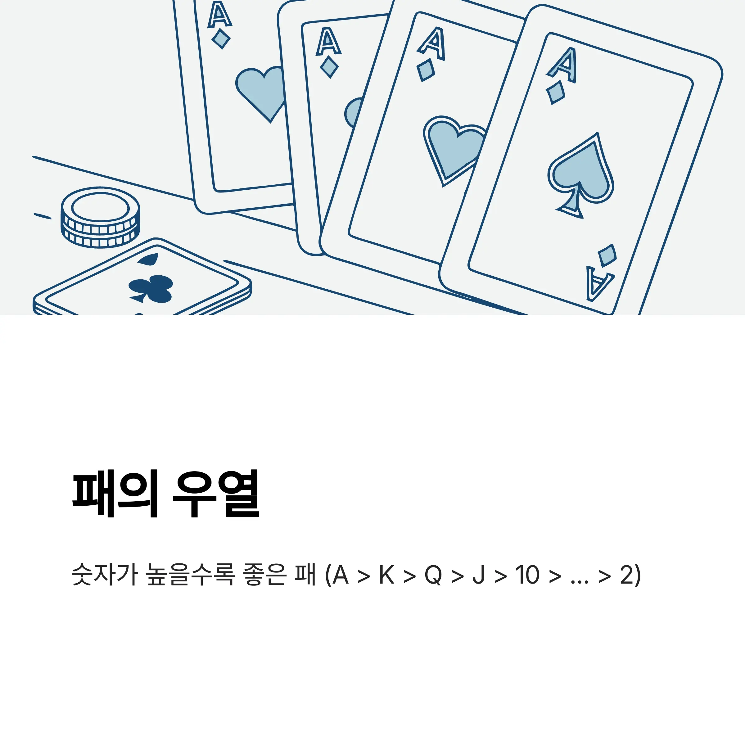 - 패의 우열: 숫자가 높을수록 좋은 패입니다. (A > K > Q > J > 10 > … > 2)