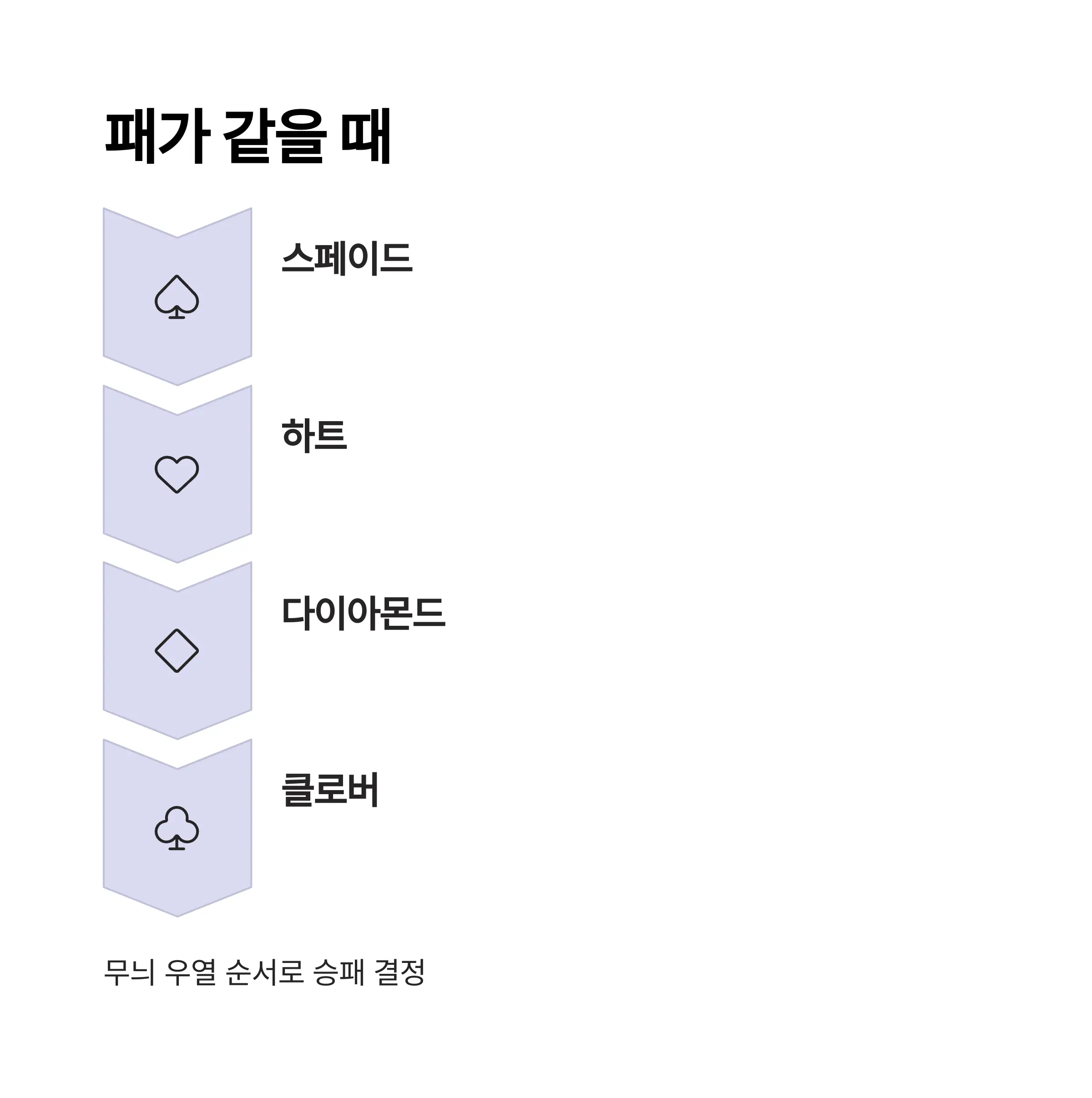 - 무늬 우열 순서: 스페이드(♠) > 하트(♥) > 다이아몬드(◆) > 클로버(♣)