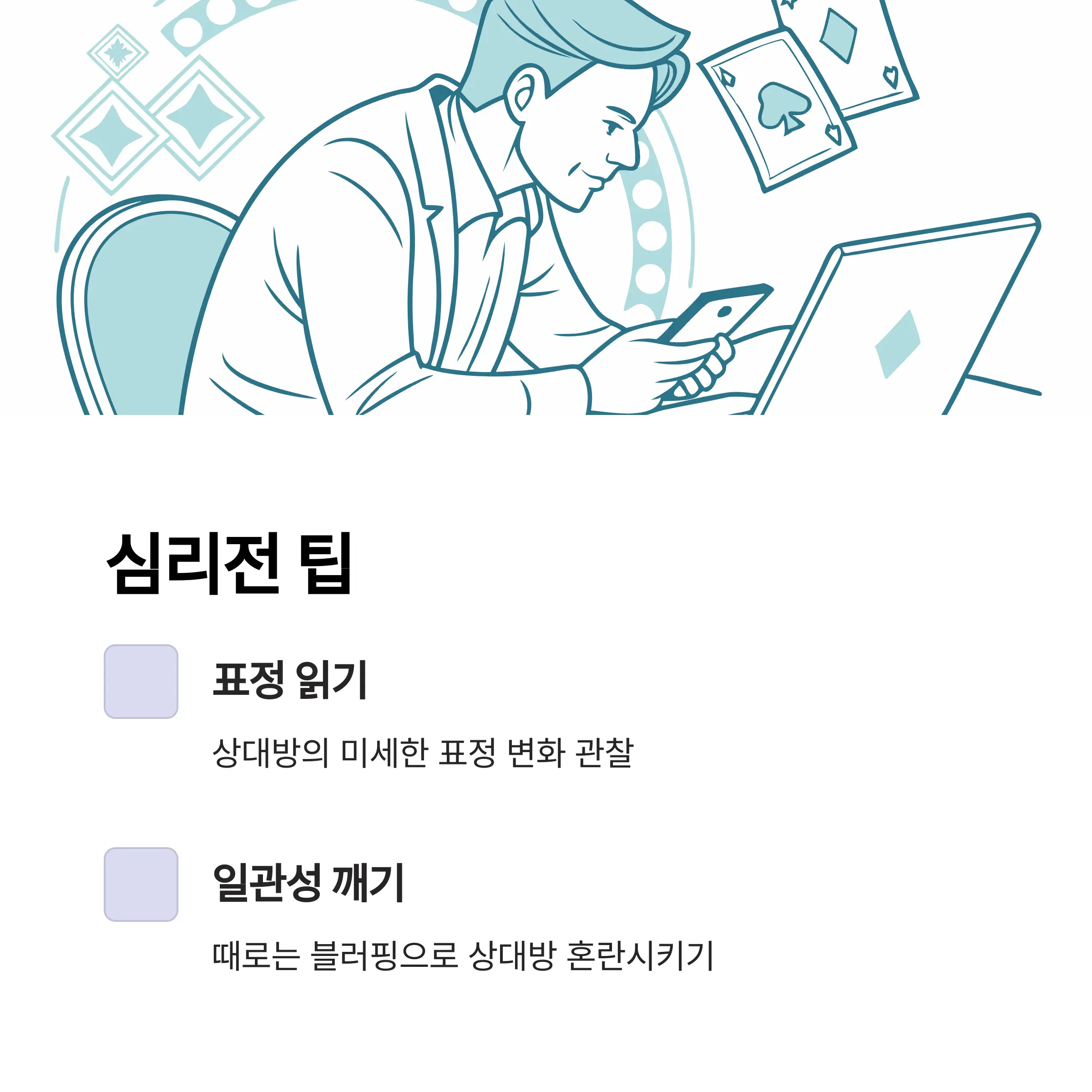 - 최소 베팅으로 시작: 처음에는 적은 금액으로 베팅하며 상대방의 반응을 살피는 것이 좋습니다.