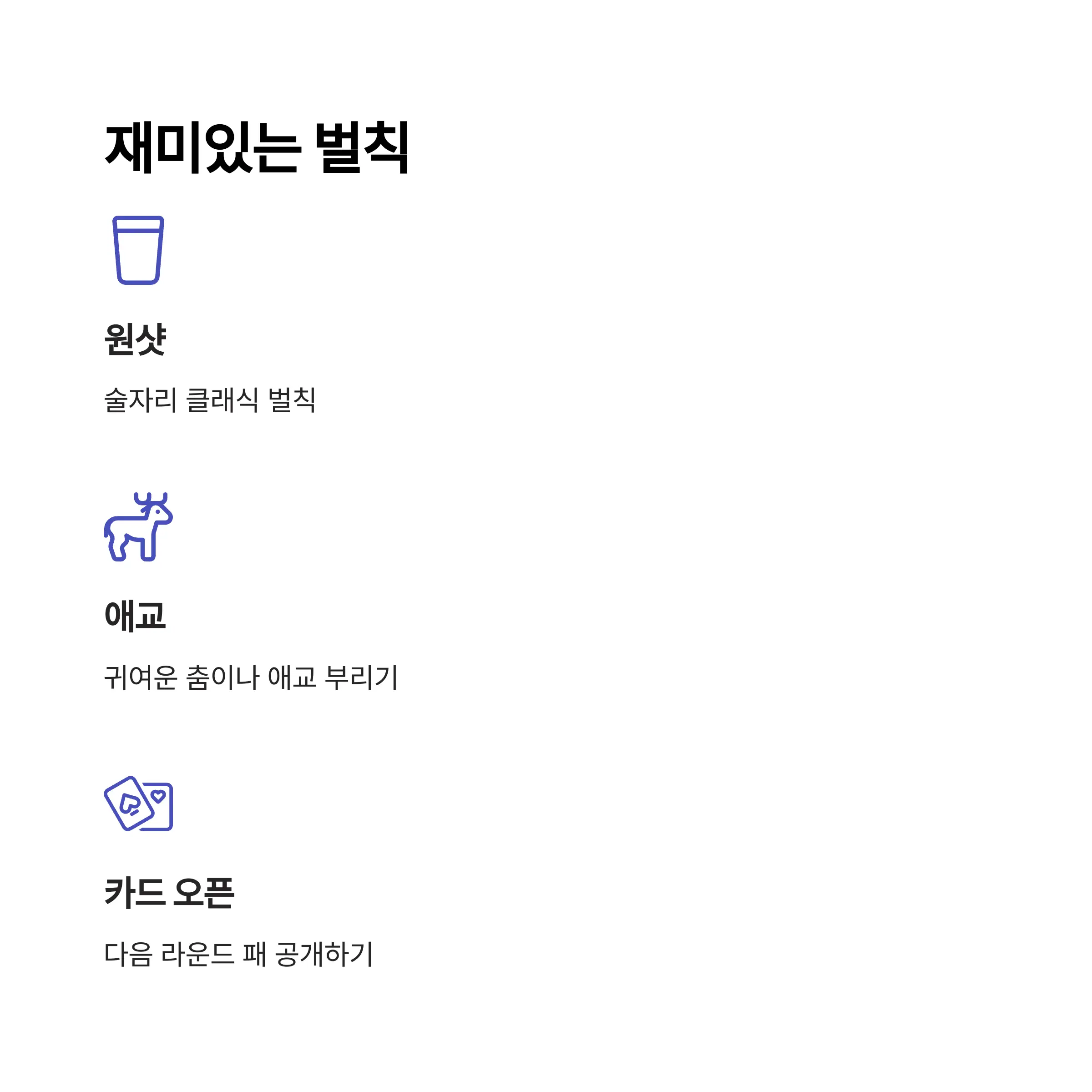 - 원샷 벌칙: 술자리에서 가장 보편적인 벌칙. (음주 시 과음 주의!)