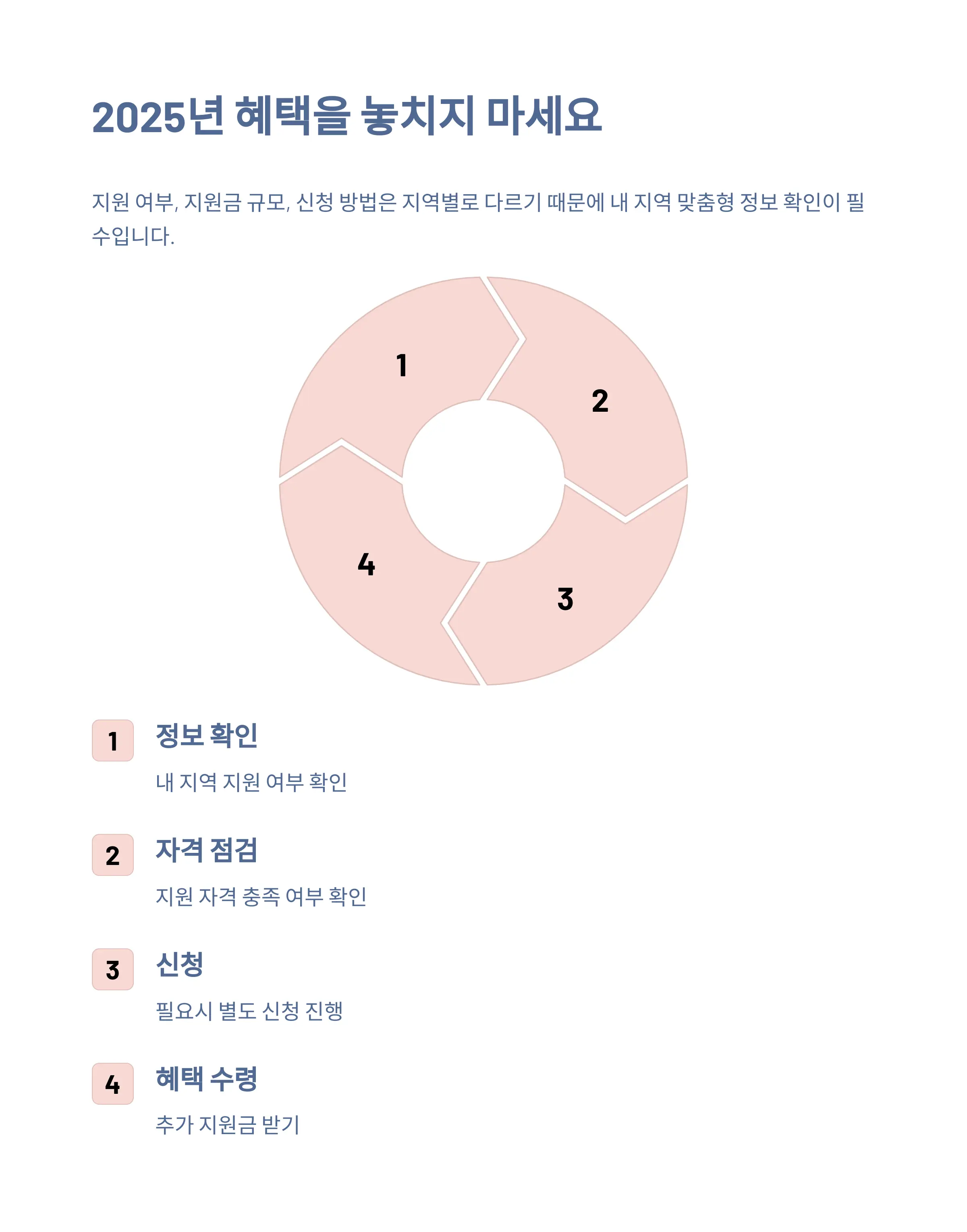 주의할 점은, 일부 지자체는 신청 기간을 놓치면 추가 지원금을 지급하지 않는다는 것입니다. 5월~6월 사이 별도로 공지되는 신청 기간을 반드시 확인해야 합니다.