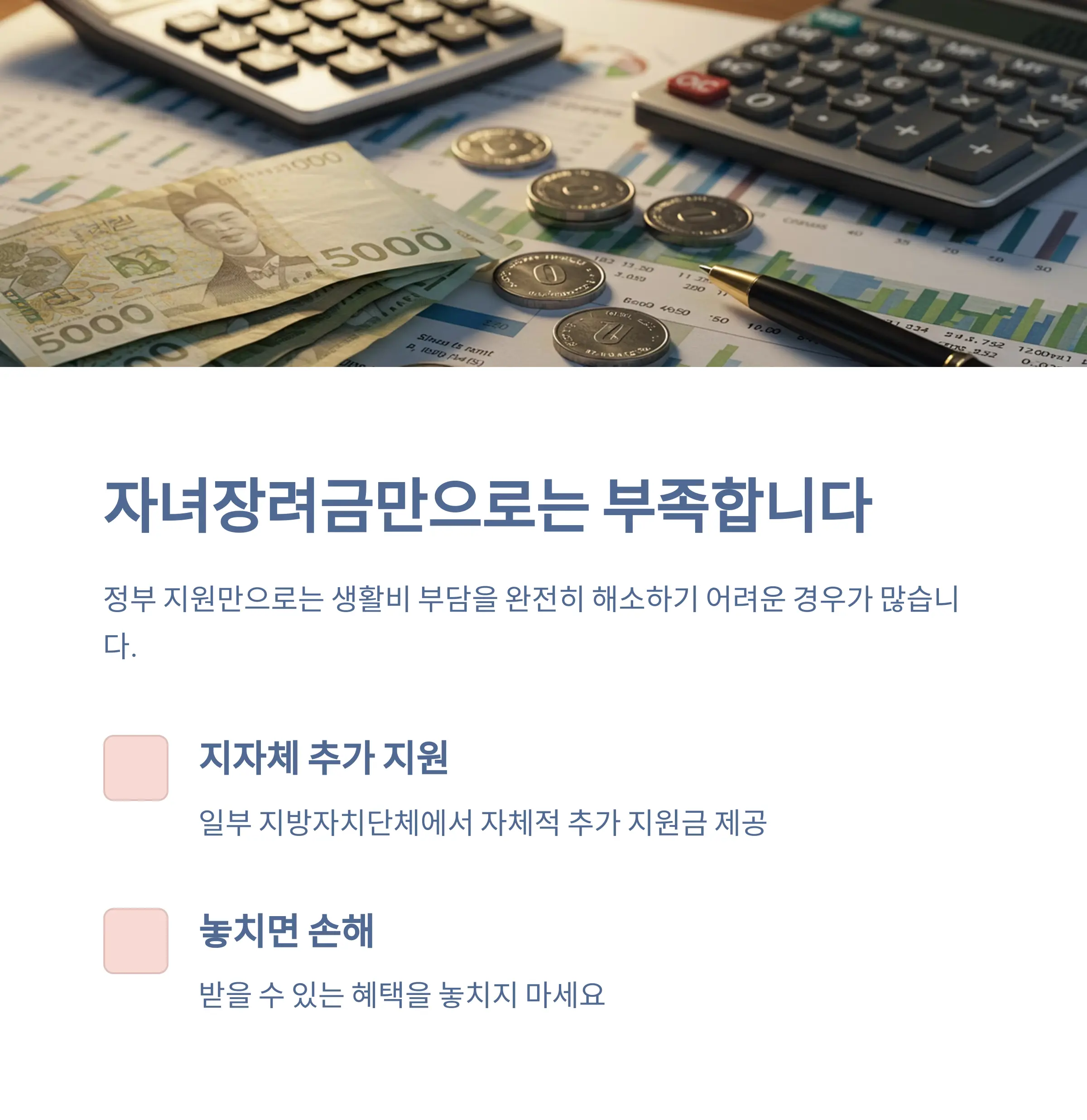 - 자녀장려금을 신청했다면, 지방자치단체 추가 지원 여부도 반드시 확인해야 합니다.