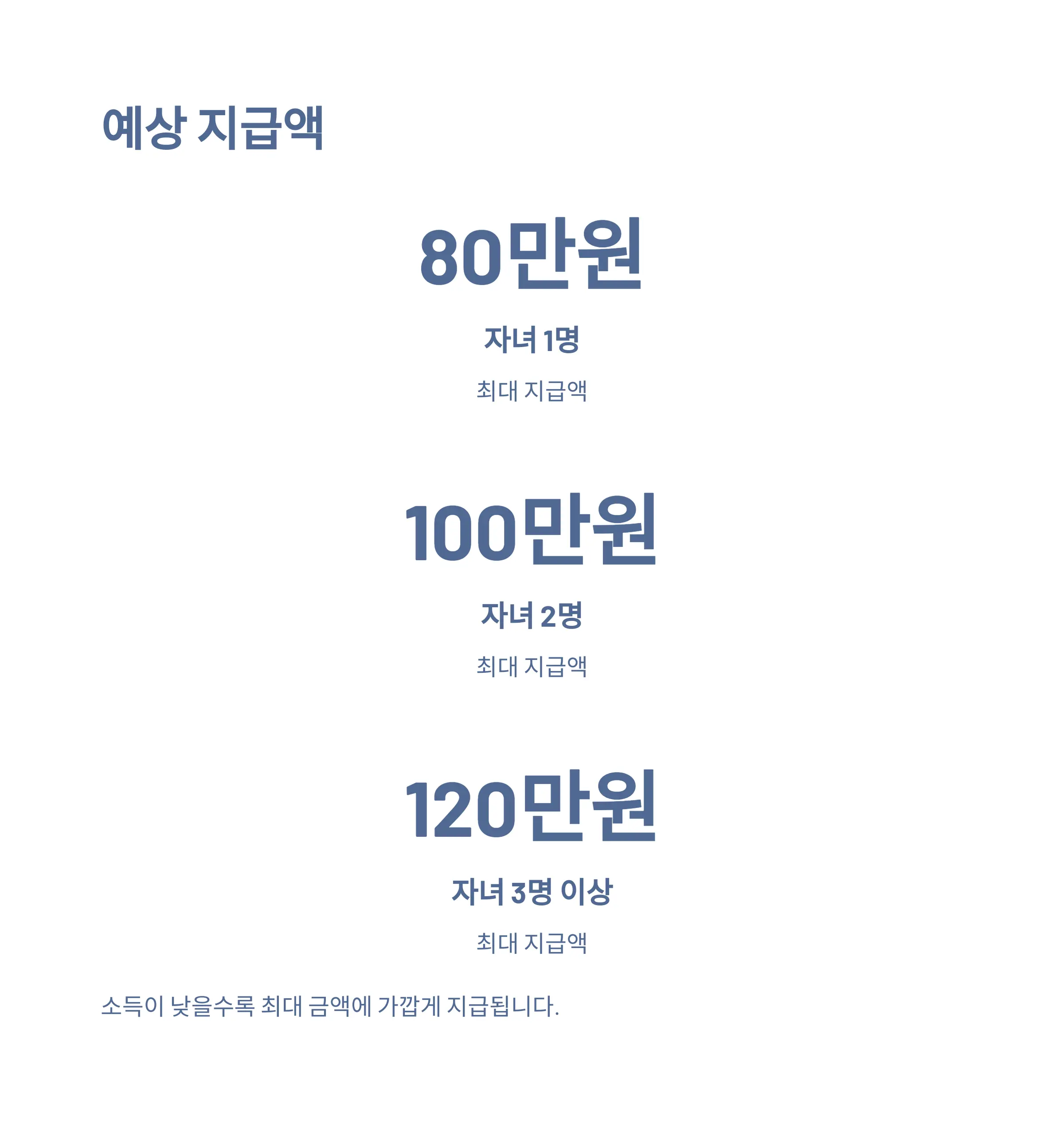 ※ 자녀 수에 따라 지급액이 증가하며, 소득이 낮을수록 최대 금액에 가깝게 지급됩니다.