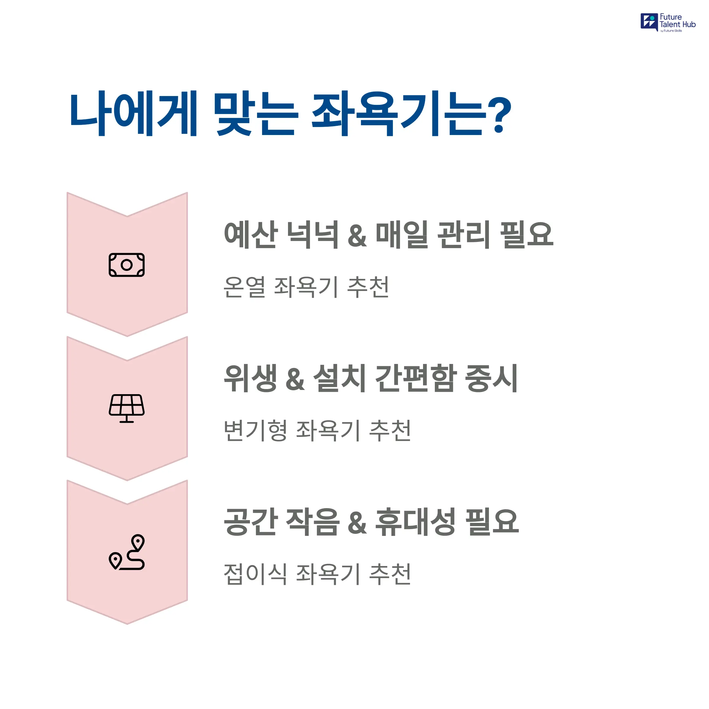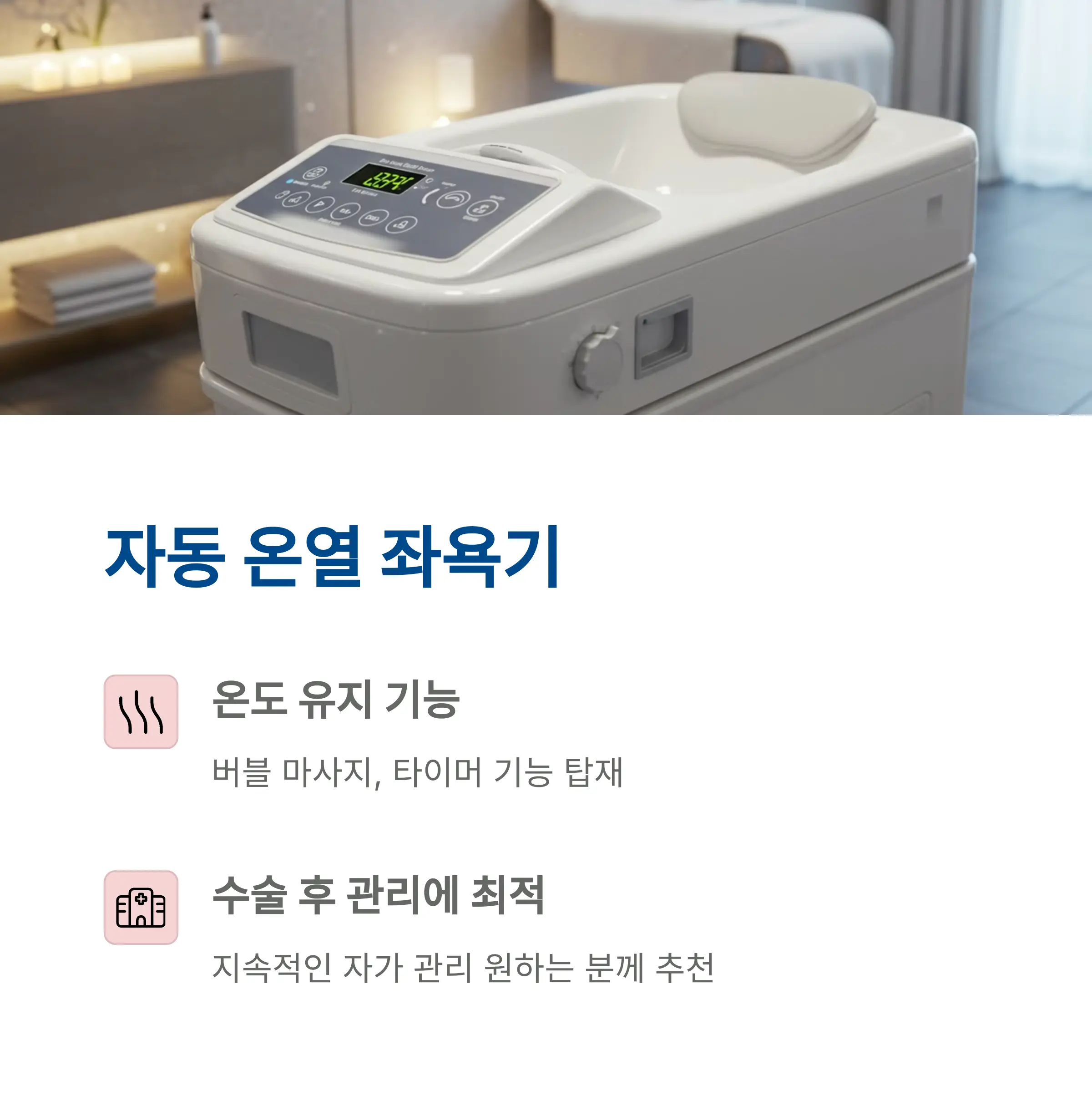 매일 좌욕을 규칙적으로 하고 싶은 분, 혹은 치질 수술 후 집중 관리가 필요한 경우에는 자동 좌욕기가 큰 만족을 줍니다. 타이머, 마사지 기능이 있어 회복 시간을 스스로 관리하기에 매우 편리하죠. 다만 욕실 공간과 예산을 고려해야 합니다.