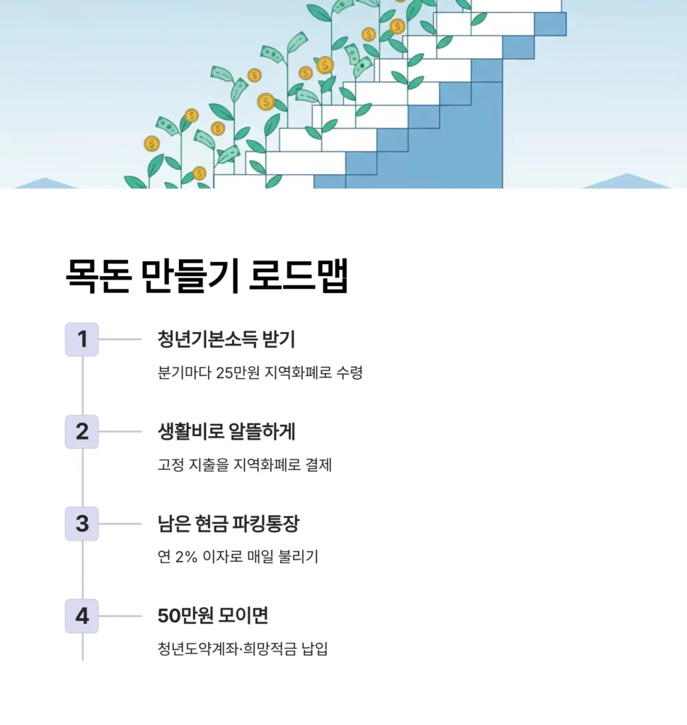 청년기본소득 지급일을 잘 저장해두고 생활비 계획에 활용하세요. 그리고 여기서 멈추지 말고 지원받은 지역화폐를 알뜰하게 사용하여 아낀 현금을 이자 주는 파킹통장으로 옮겨 목돈 만들기를 시작해야 합니다.