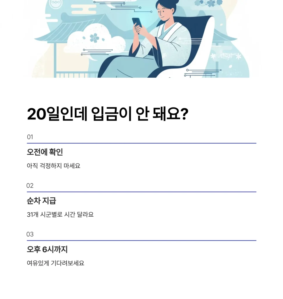 지급일(예: 10월 20일) 오전에 입금이 안 되었다고 걱정할 필요 없습니다. 경기도 31개 시/군별로 지급 시작 시간이 달라 순차적으로 지급됩니다.