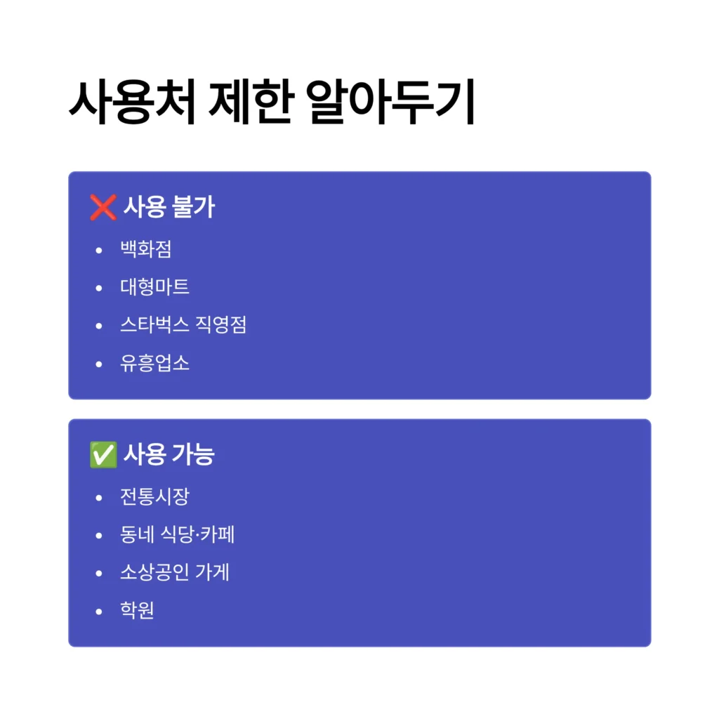 경기지역화폐는 백화점, 대형마트(이마트, 롯데마트 등), 스타벅스 등 직영 프랜차이즈, 유흥업소 등에서는 사용할 수 없습니다. 주민등록상 주소지 시/군 내의 전통시장, 소상공인 가게(식당, 카페, 학원 등)에서만 사용 가능합니다.