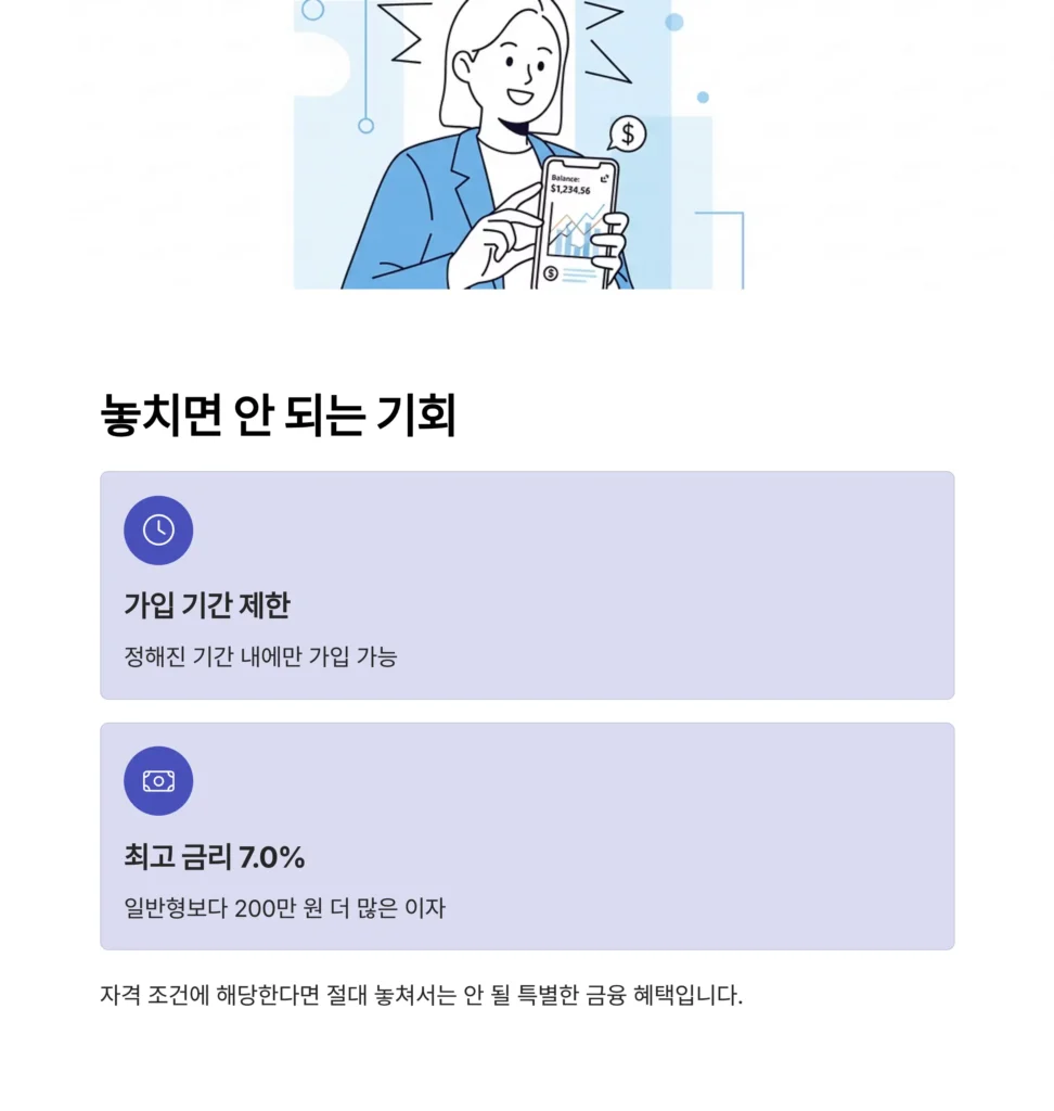 가입 기간이 정해져 있으니 망설이지 마시고 지금 바로 필요한 서류를 준비하여 주거래 은행 앱을 통해 우대형 가입 가능 여부를 확인해보시길 바랍니다.