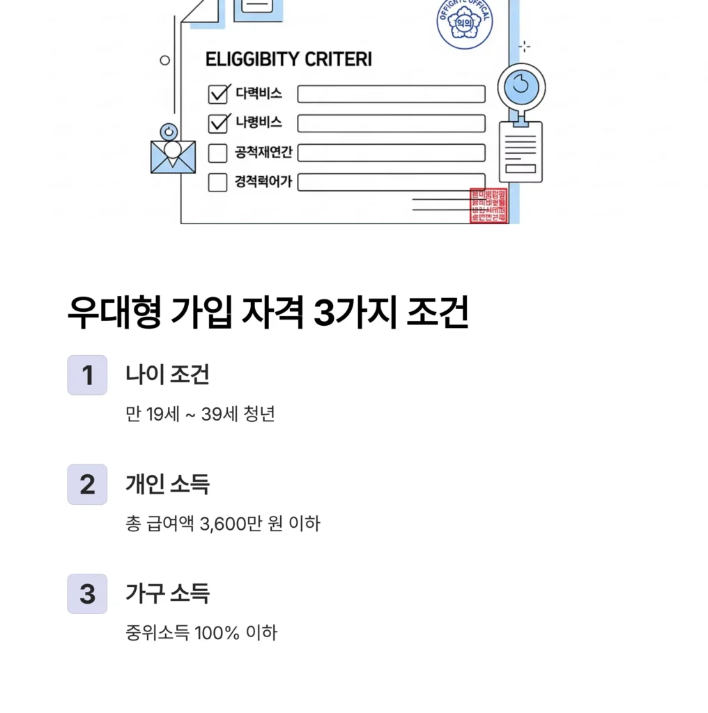 위 3가지 조건을 모두 충족하는 저소득 청년, 중소기업 재직 청년 등이 주요 우대형 가입 대상입니다.