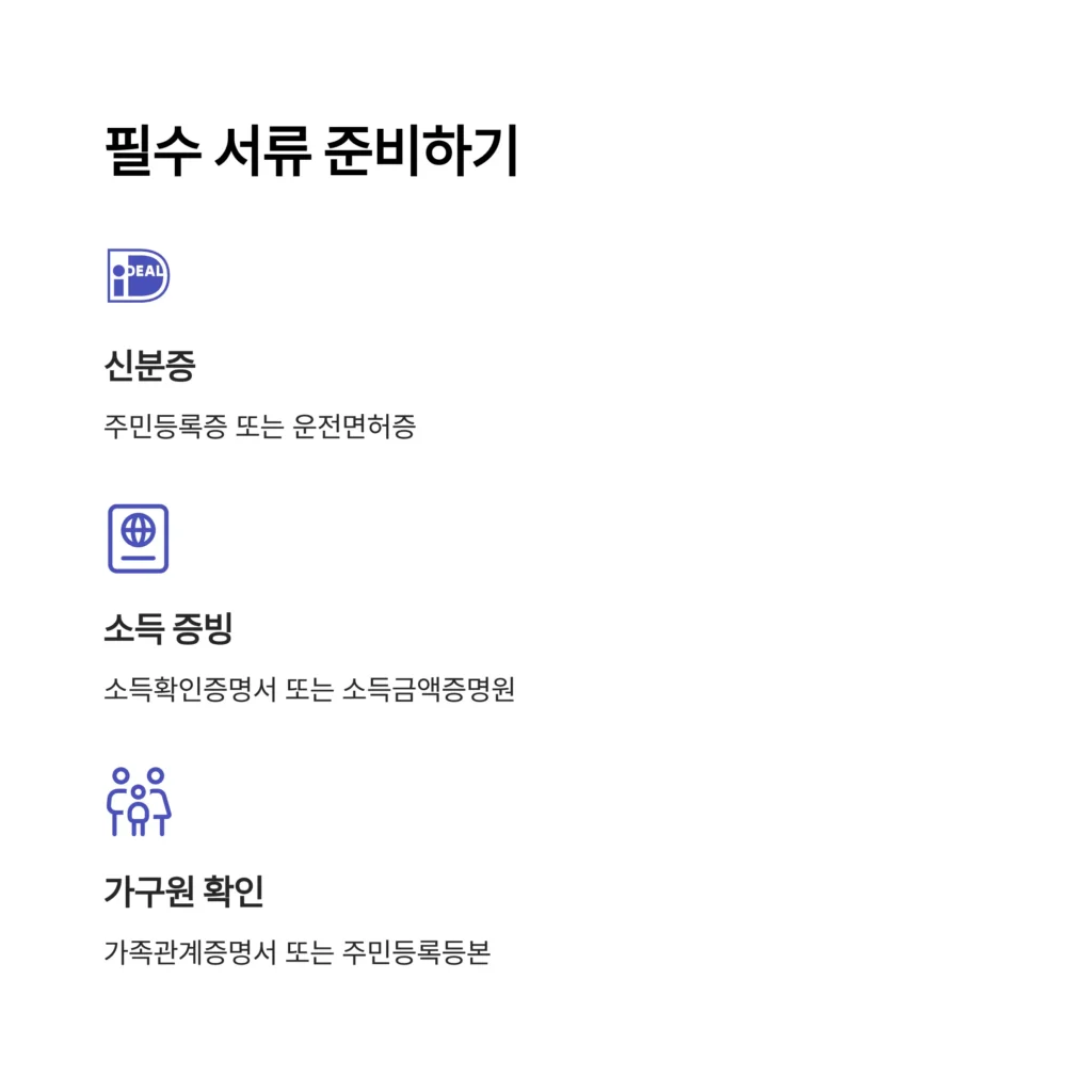 | 필요 서류 | 신분증 | 신분증 + 소득확인증명서, 가족관계증명서 등 |