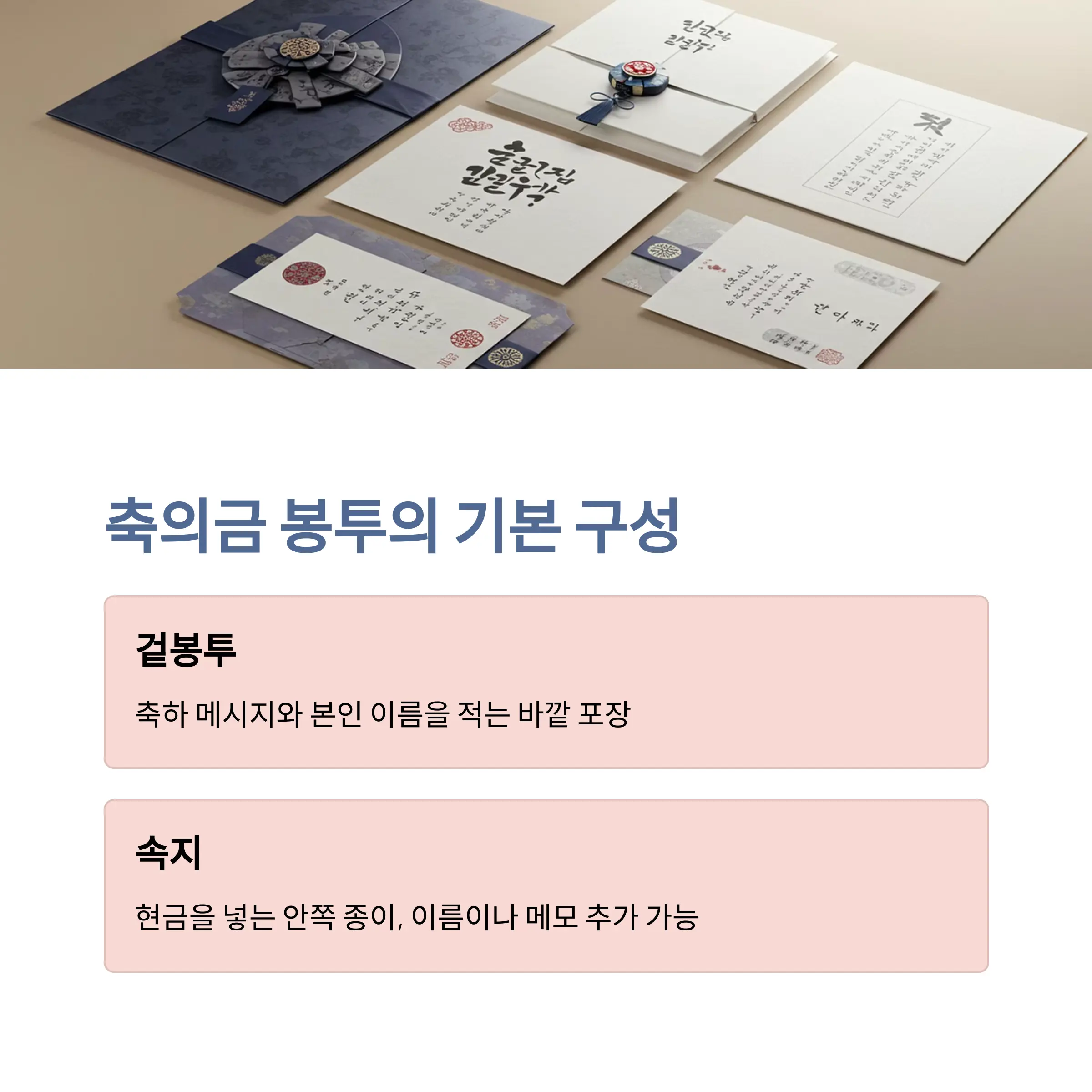 - 속지: 현금을 넣는 안쪽 종이. 이름을 한 번 더 적거나, 간단한 메모를 남길 수 있습니다.
