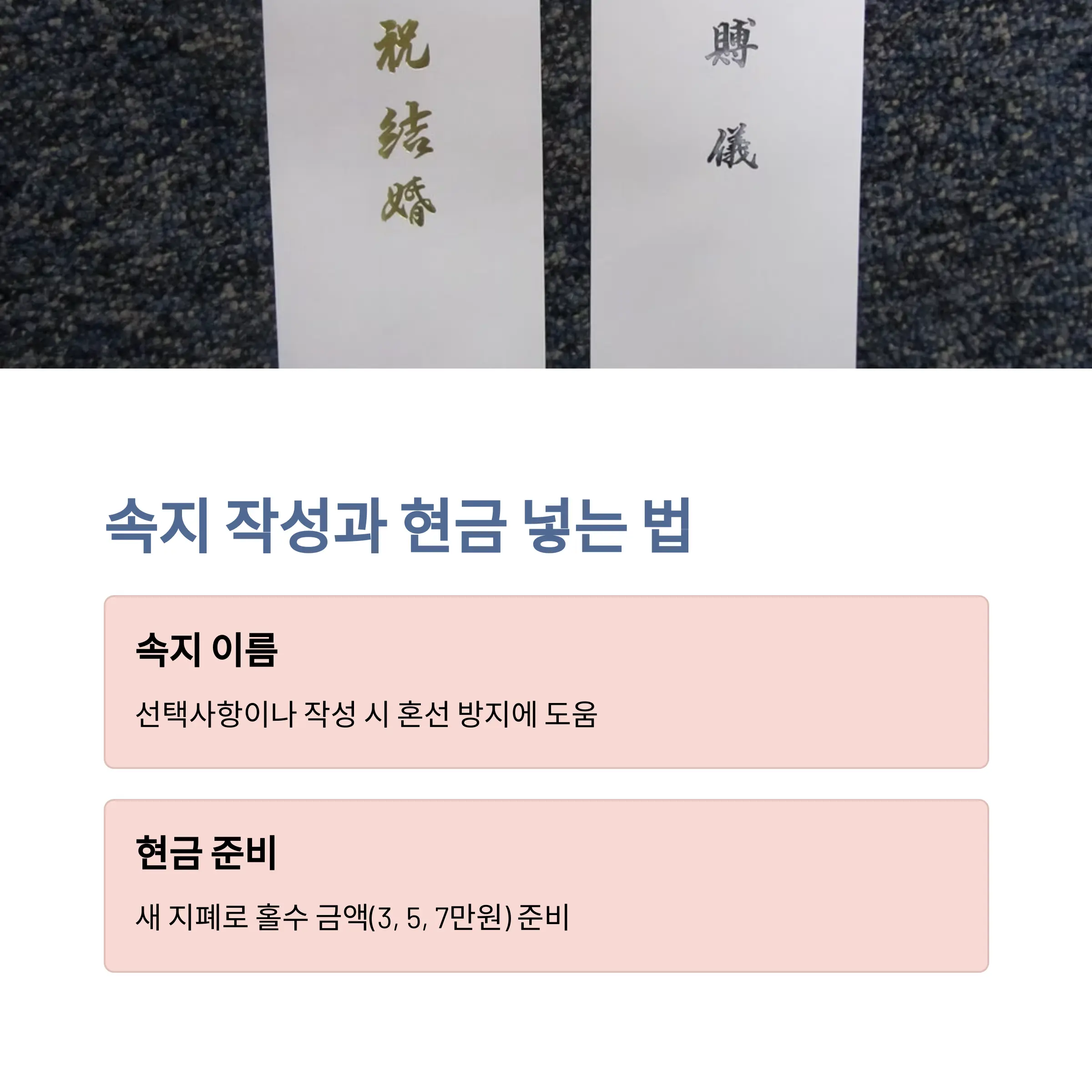 - 속지가 없을 경우, 봉투 안에서 돈이 흐트러지지 않도록 종이로 감싸거나 잘 접어넣으세요.