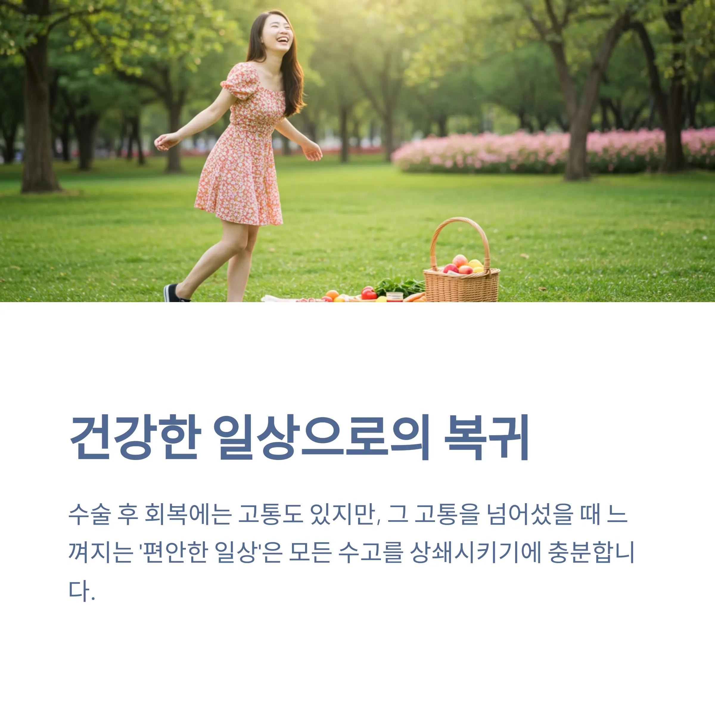 수술 후 회복에는 분명 고통도 있지만, 그 고통을 넘어섰을 때 느껴지는 ‘편안한 일상’은 모든 수고를 상쇄시키기에 충분합니다.