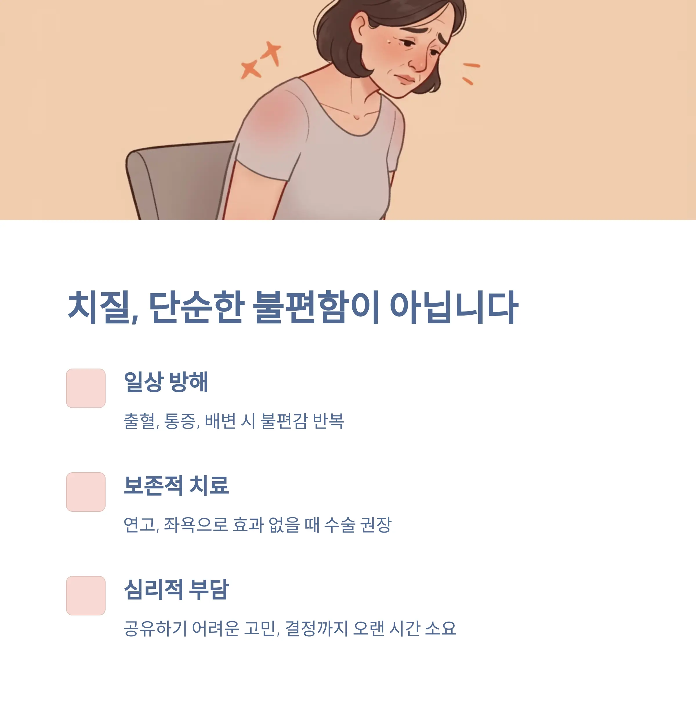 치질은 단순히 불편한 질환을 넘어 일상생활 자체를 어렵게 만드는 문제입니다. 출혈, 통증, 배변 시 불편감이 반복되고 연고나 좌욕 같은 보존적 치료로 효과가 없을 경우, 의료진은 수술을 권합니다.