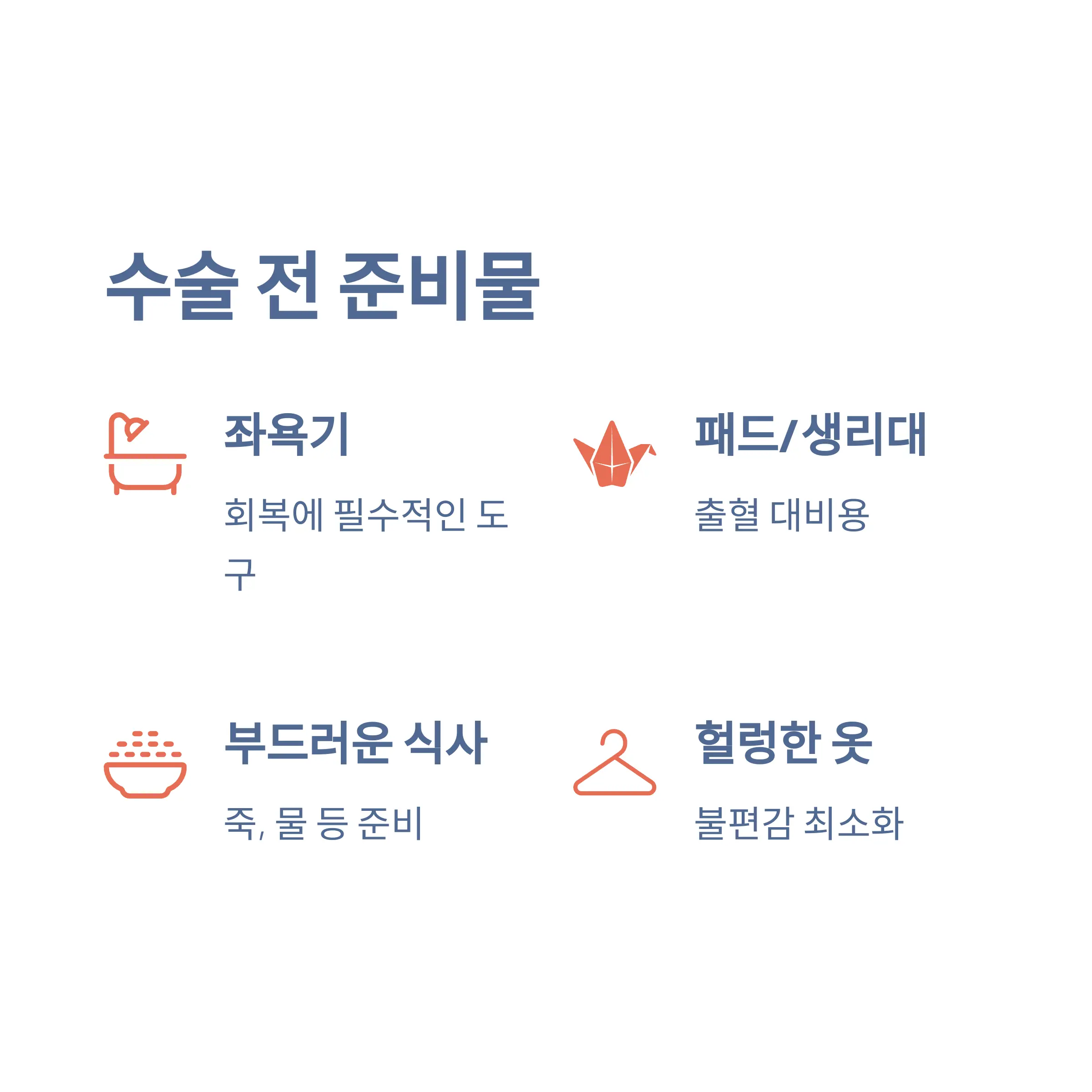 준비물은 단순하지만, 이 작은 준비들이 수술 후 회복 속도를 좌우하기도 합니다. 특히 좌욕기는 필수품이며, 수술 전에 미리 준비해두면 훨씬 수월하게 초기 회복을 관리할 수 있습니다.