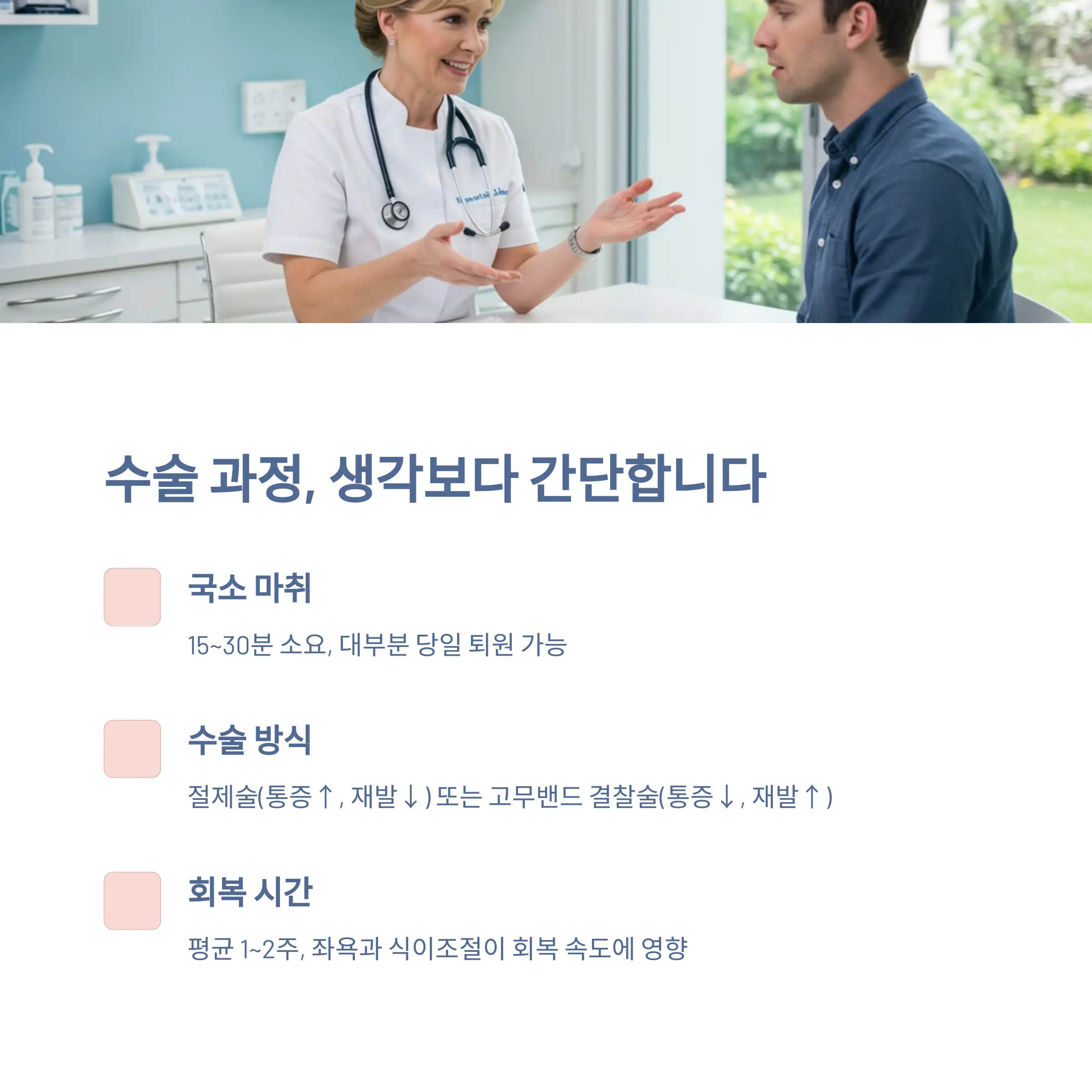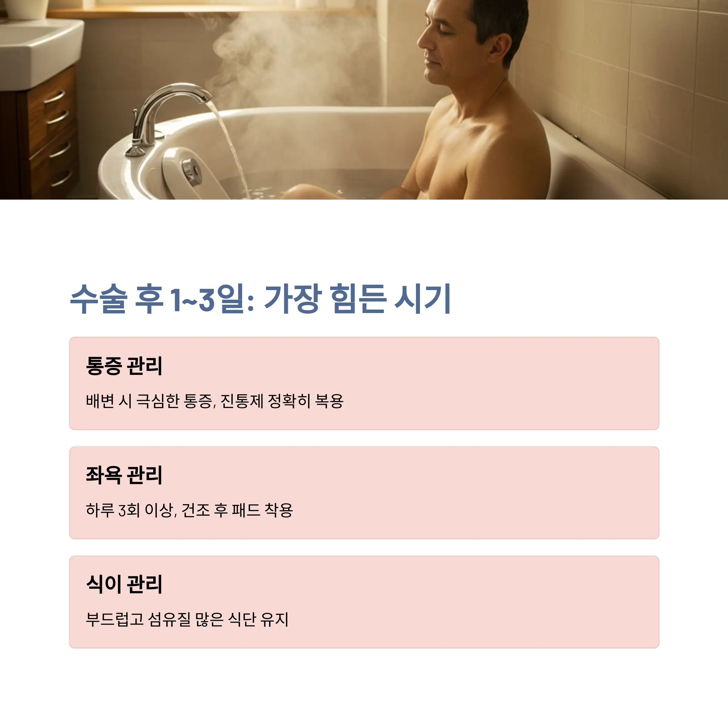 이후엔 건강관리 차원에서 변비 예방, 좌욕 유지, 수분 섭취를 습관화하면 재발도 줄일 수 있습니다.