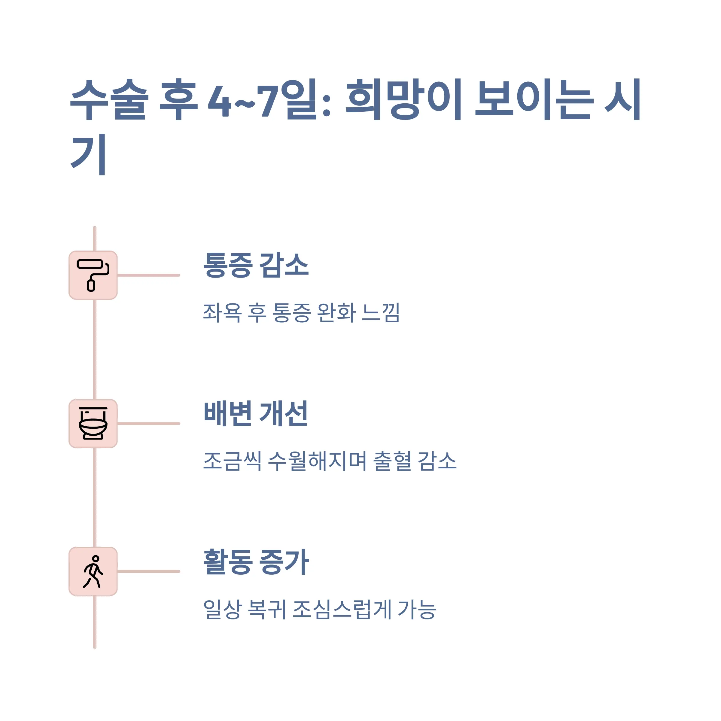 이 시기는 정신적으로도 가장 힘든 시기입니다. 통증뿐 아니라, ‘정말 나아질까?’라는 회의감도 들 수 있습니다. 하지만 하루하루를 넘기며 서서히 회복이 시작되는 걸 느끼면, 그 고통도 점차 줄어들게 됩니다. 무엇보다 중요한 건 스스로를 너무 몰아붙이지 않는 것입니다.