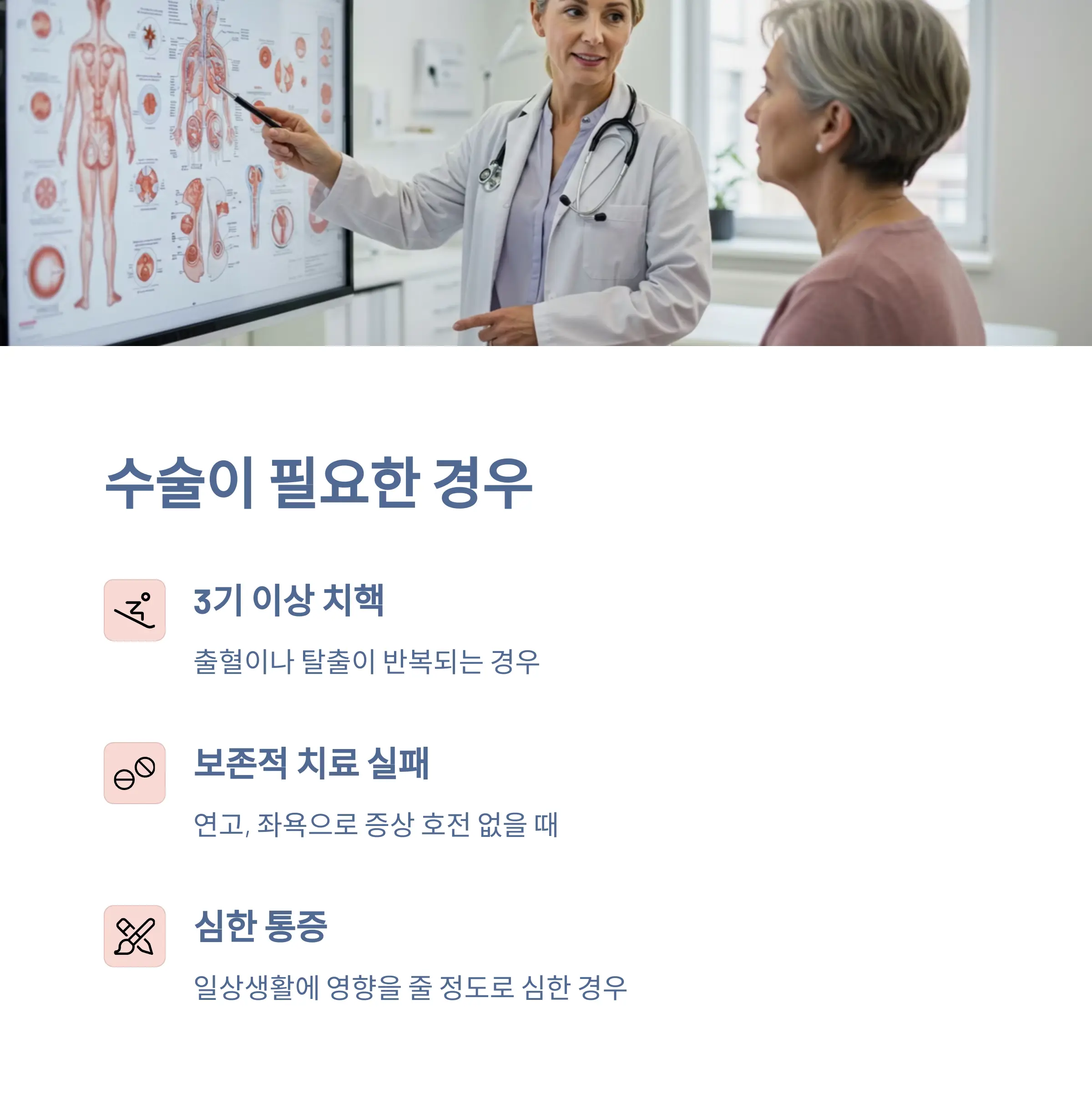 - 보존적 치료(연고, 좌욕 등)로 증상 호전이 없는 경우