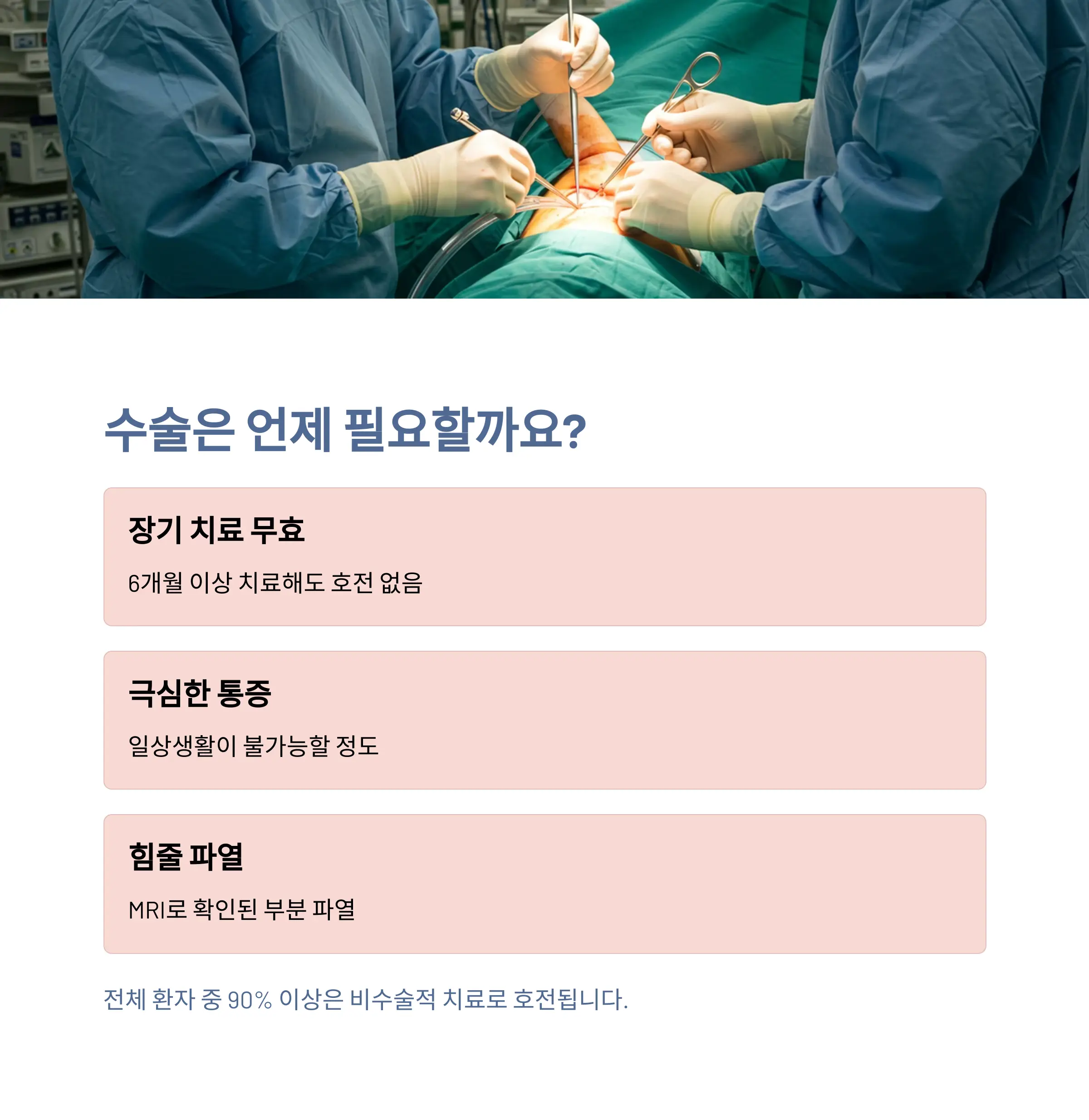 하지만 수술은 마지막 선택지이며, 충분한 비수술 치료 후에도 효과가 없을 때만 고려합니다.