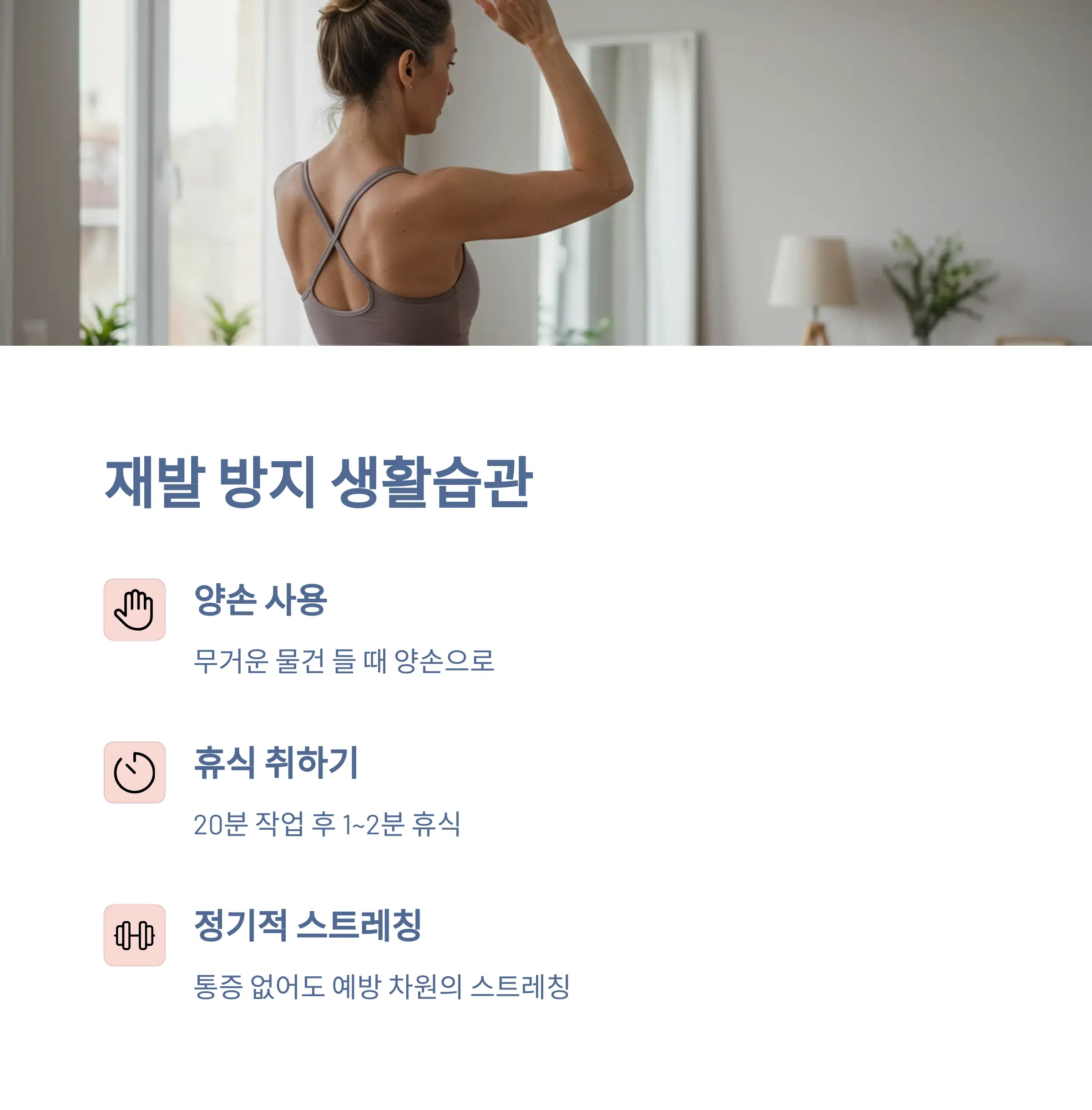 당장 통증을 줄이는 것도 중요하지만, 장기적으로 팔을 건강하게 쓰기 위한 전략이 더 중요합니다.