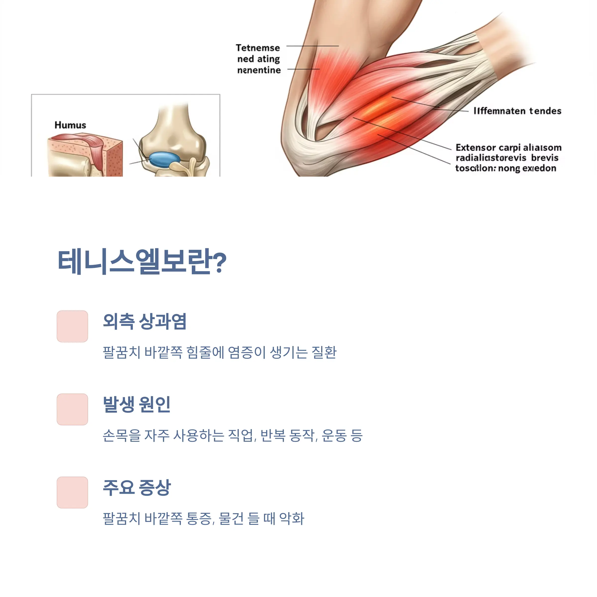 테니스엘보는 정식 명칭으로 ‘외측 상과염’이라 부르며, 팔꿈치 바깥쪽의 힘줄이 반복적인 사용으로 인해 염증이 생기는 질환입니다.