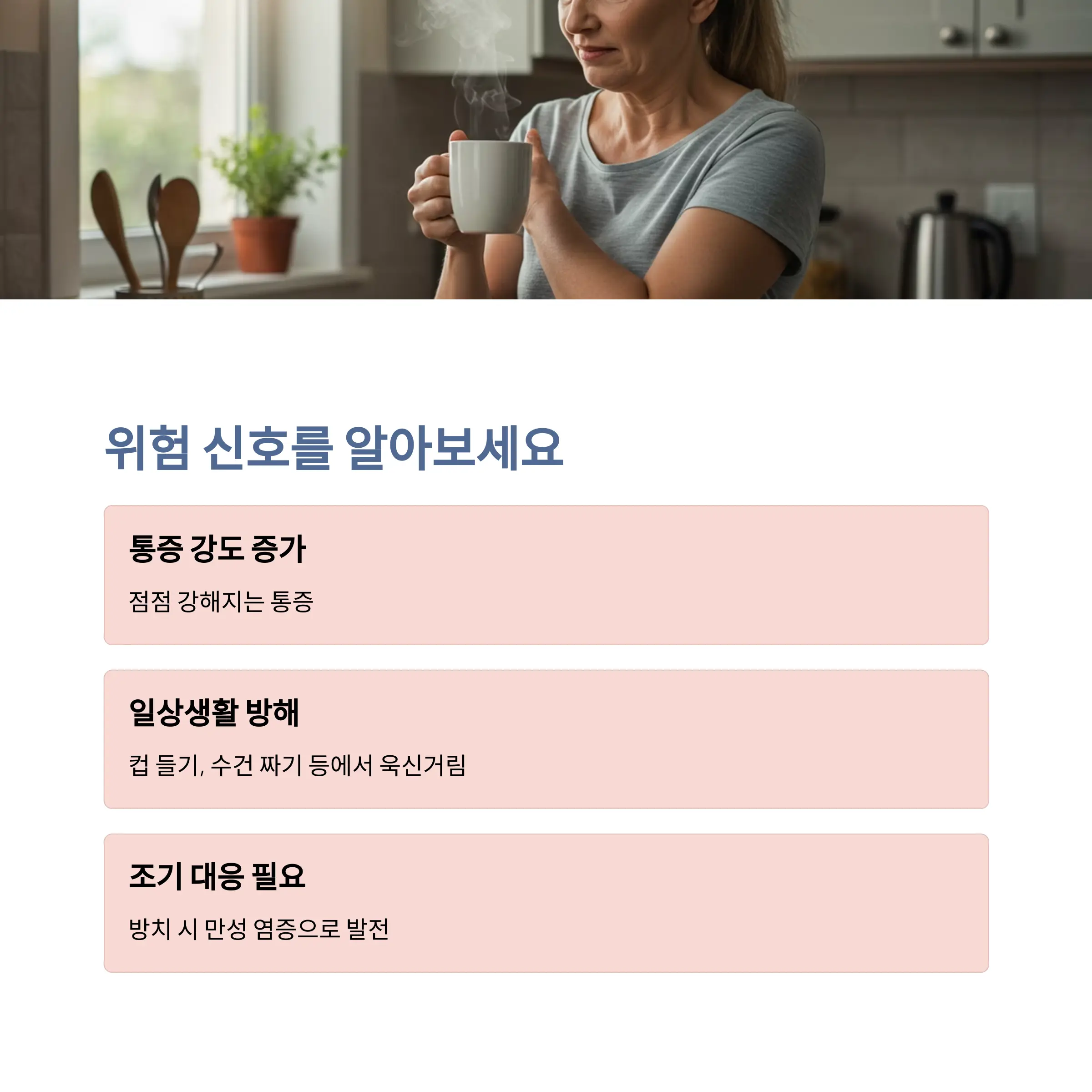 특히 컵을 들거나, 수건을 짜는 일처럼 사소한 행동에서조차 ‘욱신거림’이 반복된다면 이미 염증이 진행되고 있을 수 있습니다.