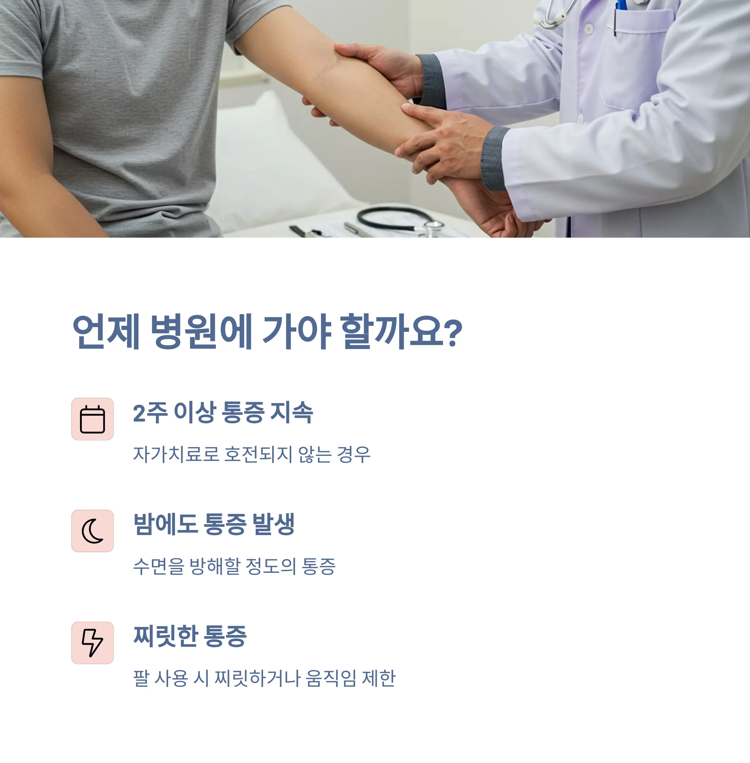 이미 통증이 2주 이상 지속됐거나, 밤에 아파서 깨는 경우라면 병원 진료가 꼭 필요합니다.