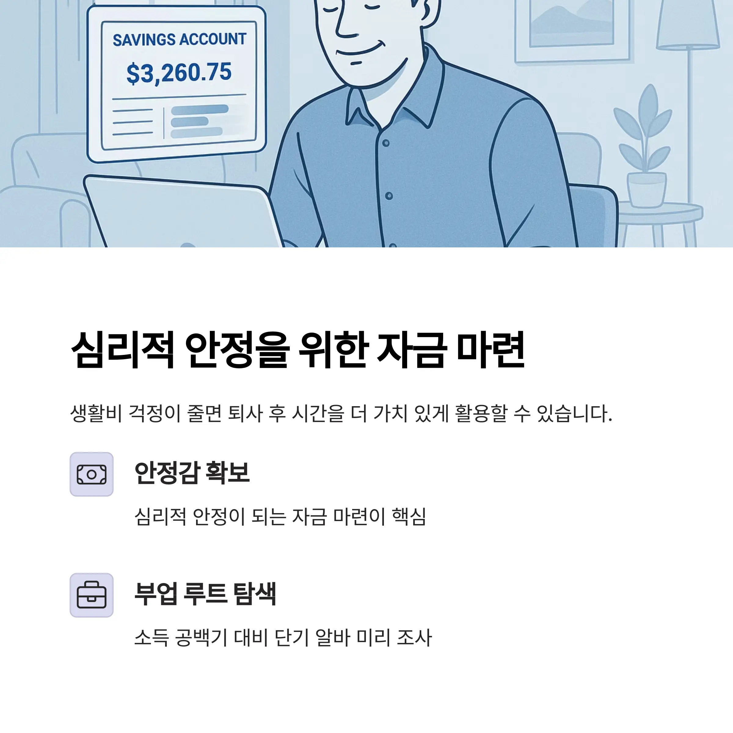 생활비 걱정이 줄면 퇴사 후 시간을 더 가치 있게 쓸 수 있습니다.