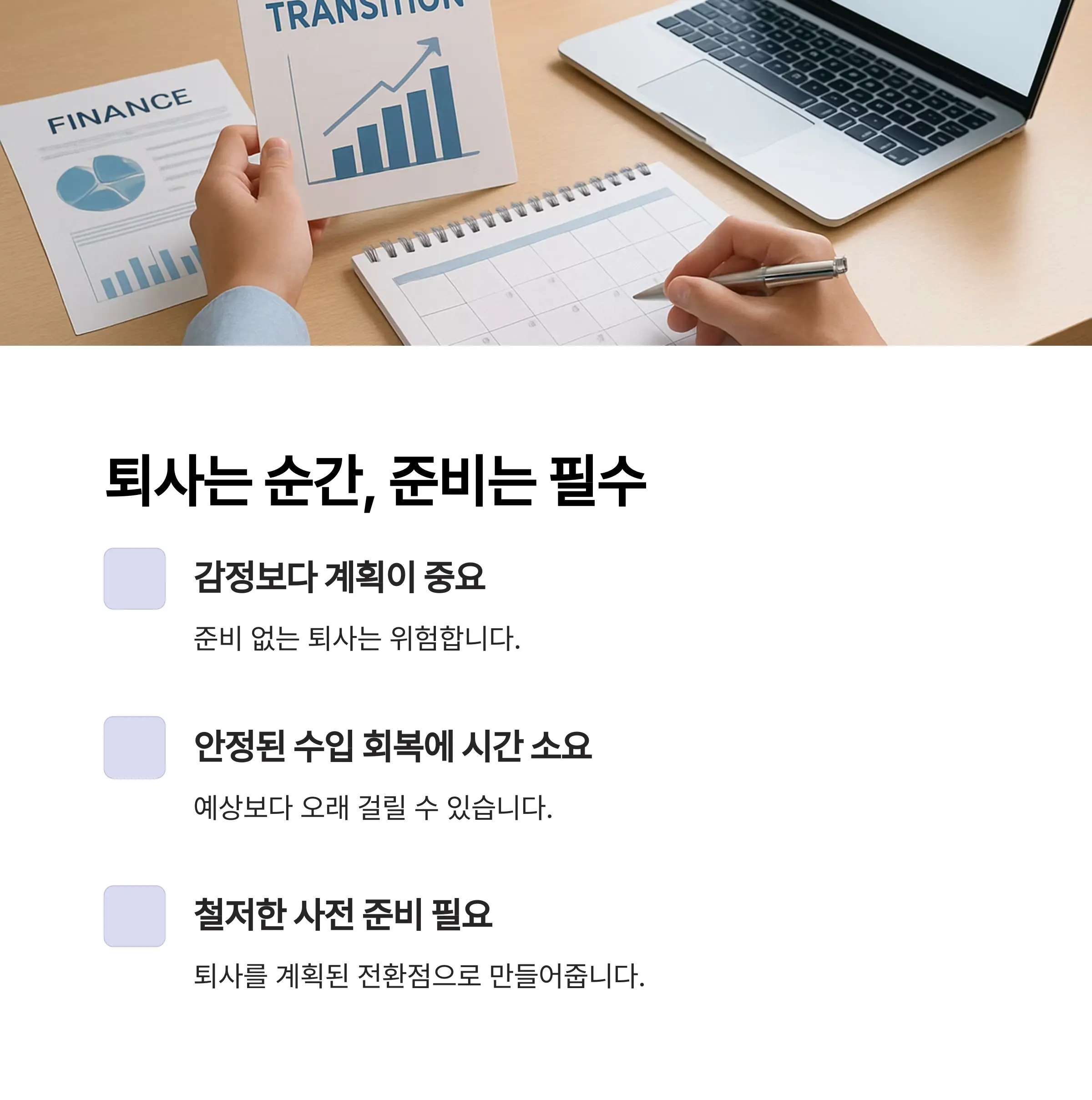 그만큼 철저한 사전 준비가 내 퇴사를 ‘계획된 전환점’으로 바꿔줍니다.