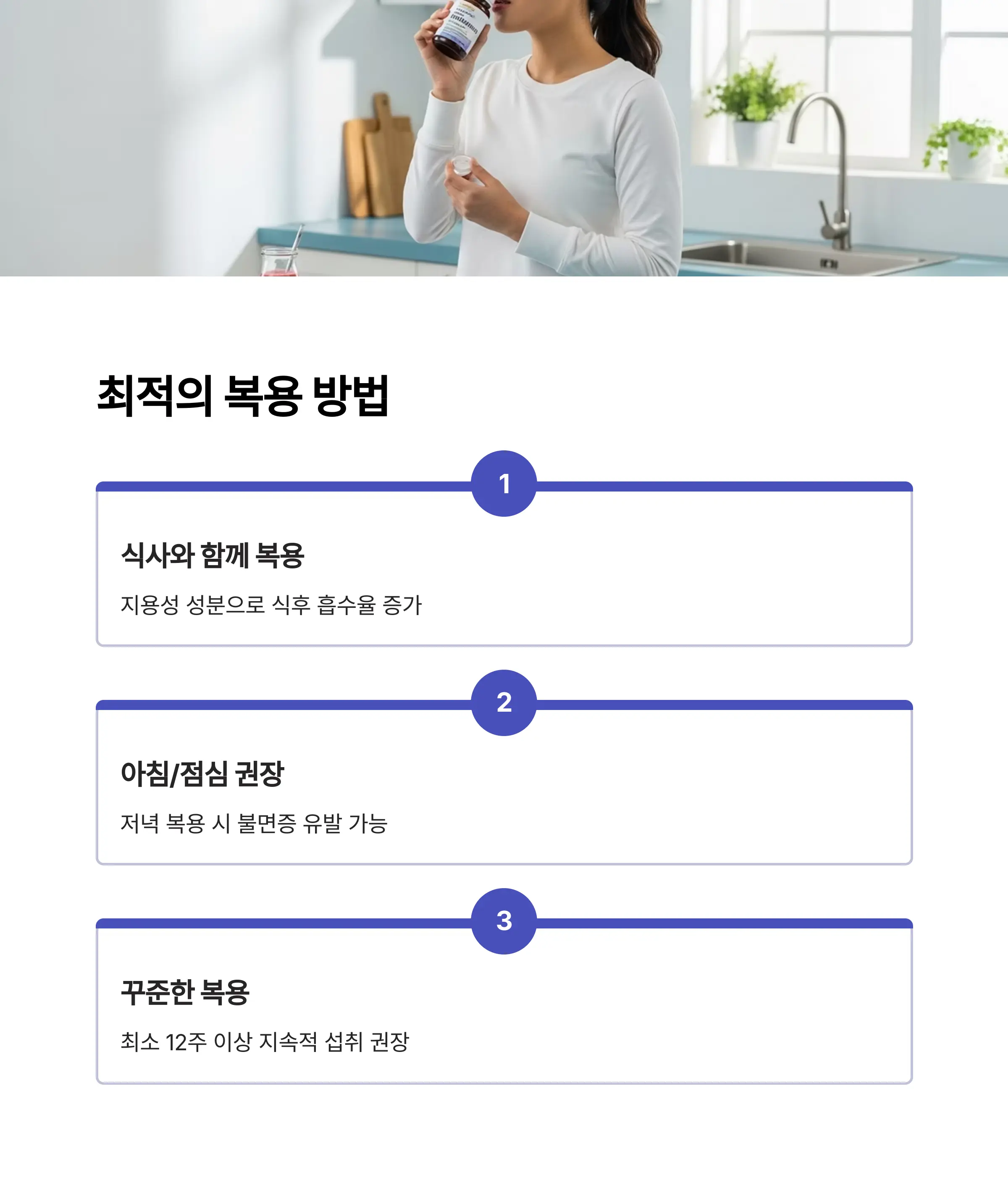 - 식사와 함께 또는 식후: 지용성 성분이므로 식사와 함께 또는 식후에 섭취하는 것이 흡수율을 높이는 데 도움이 됩니다.