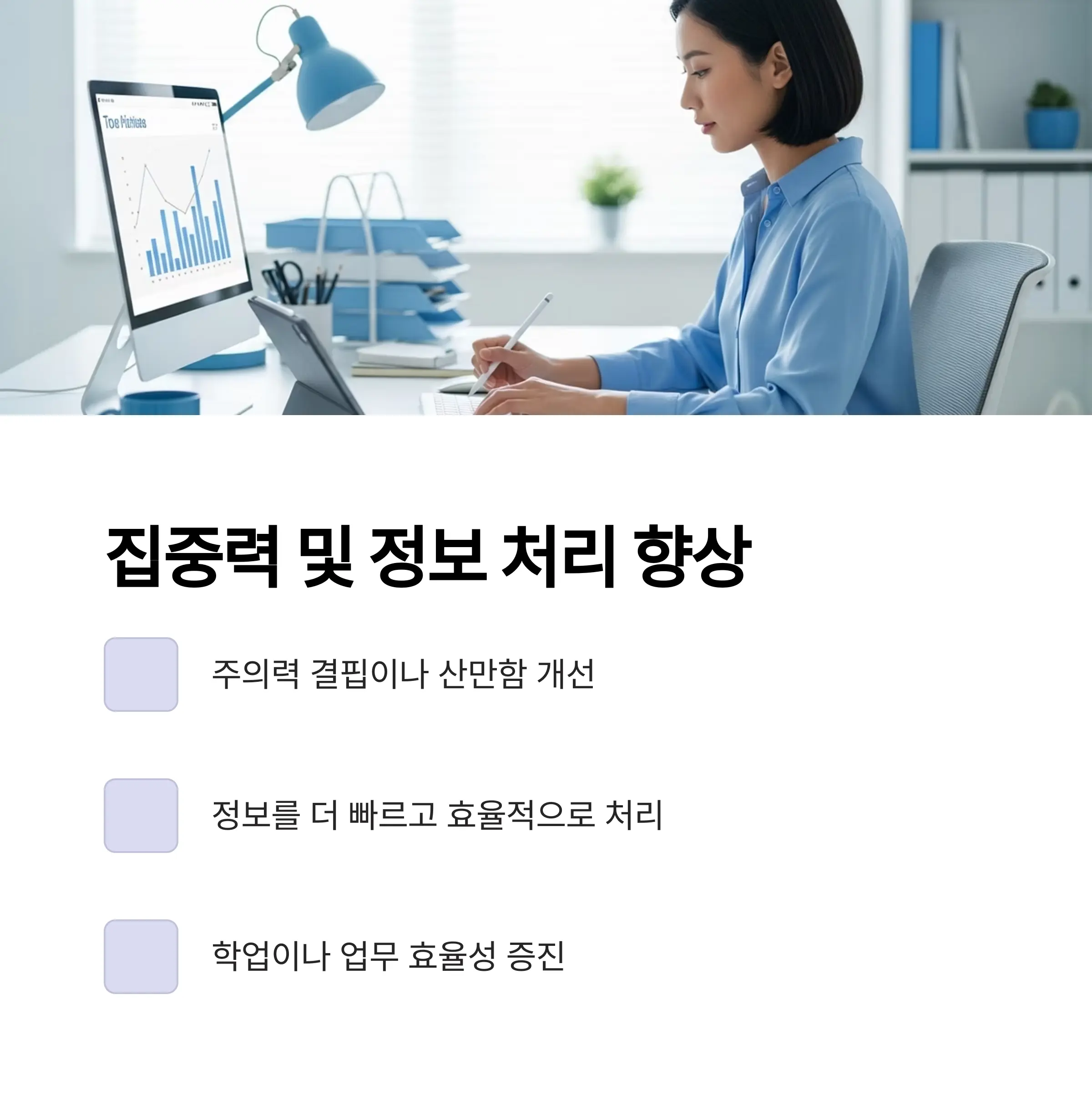 뇌의 신경 전달 물질 대사에 영향을 미쳐 주의력 결핍이나 산만함을 개선하고 정보를 더 빠르고 효율적으로 처리하는 데 도움을 줄 수 있습니다. 이는 학업이나 업무 효율성 증진에 긍정적인 영향을 미칩니다.