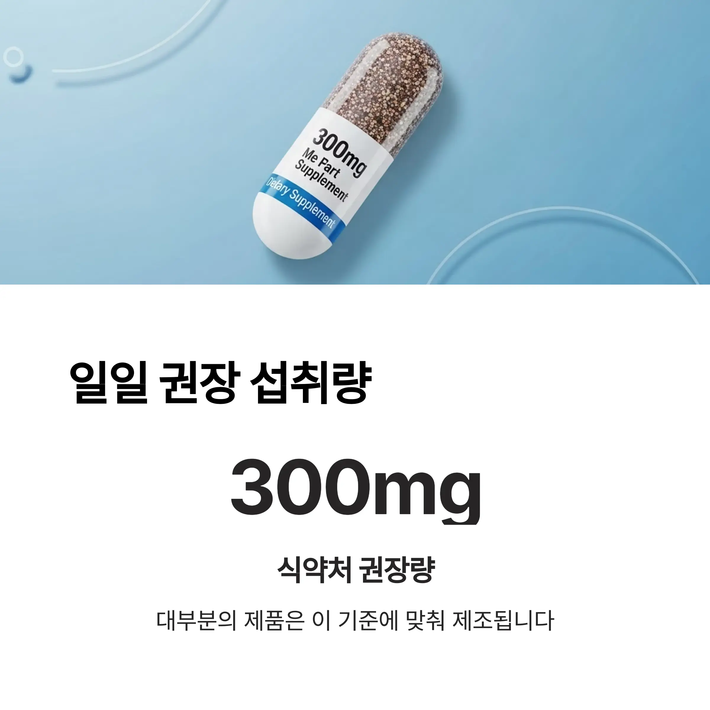식품의약품안전처에서 고시한 포스파티딜세린의 일일 권장 섭취량은 300mg입니다. 대부분의 제품은 이 기준에 맞춰 제조됩니다.