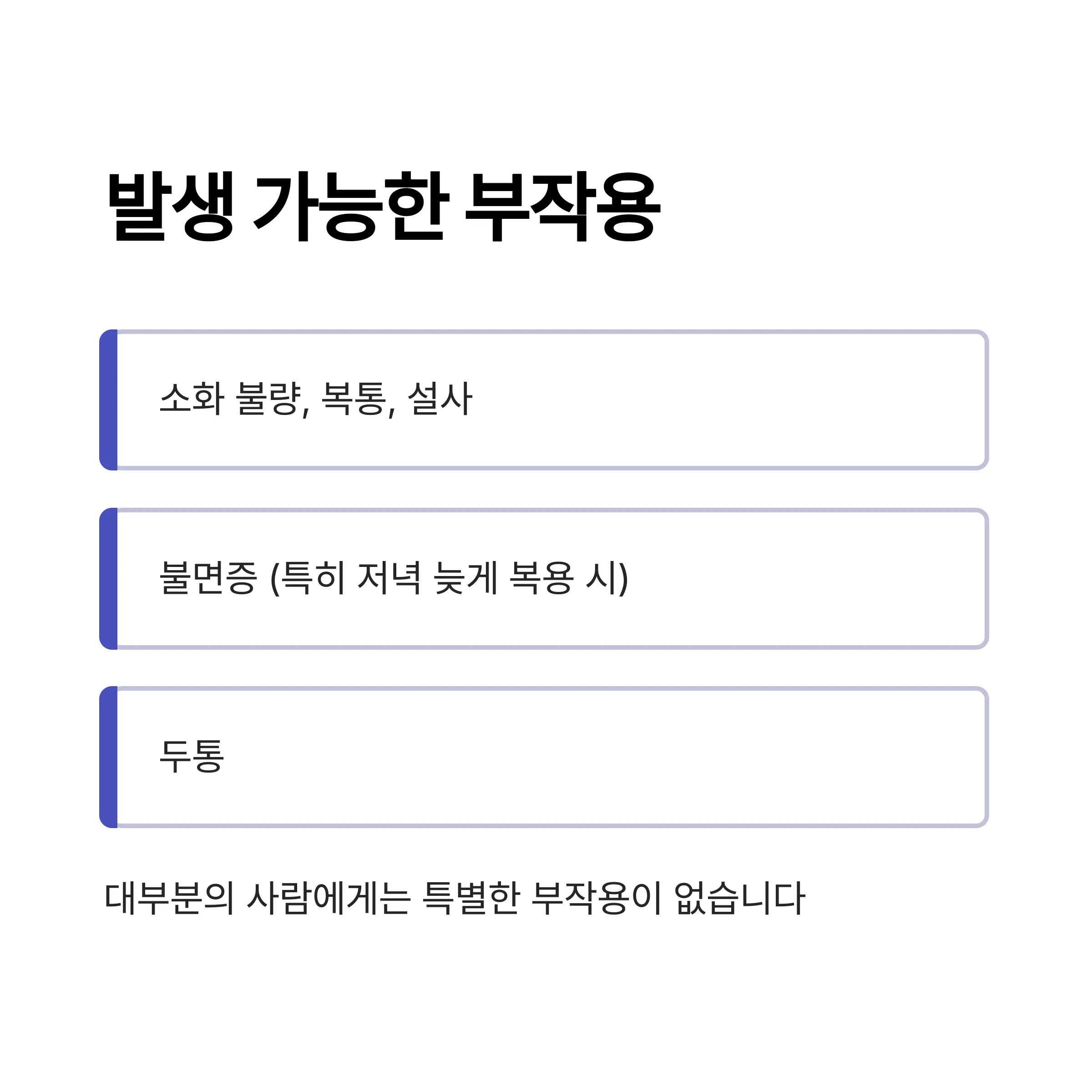 권장 섭취량을 초과하여 과다 복용할 경우 위장 장애(복통, 설사)나 불면증 등의 부작용이 심해질 수 있습니다. 반드시 제품에 표기된 권장량을 지켜야 합니다.
