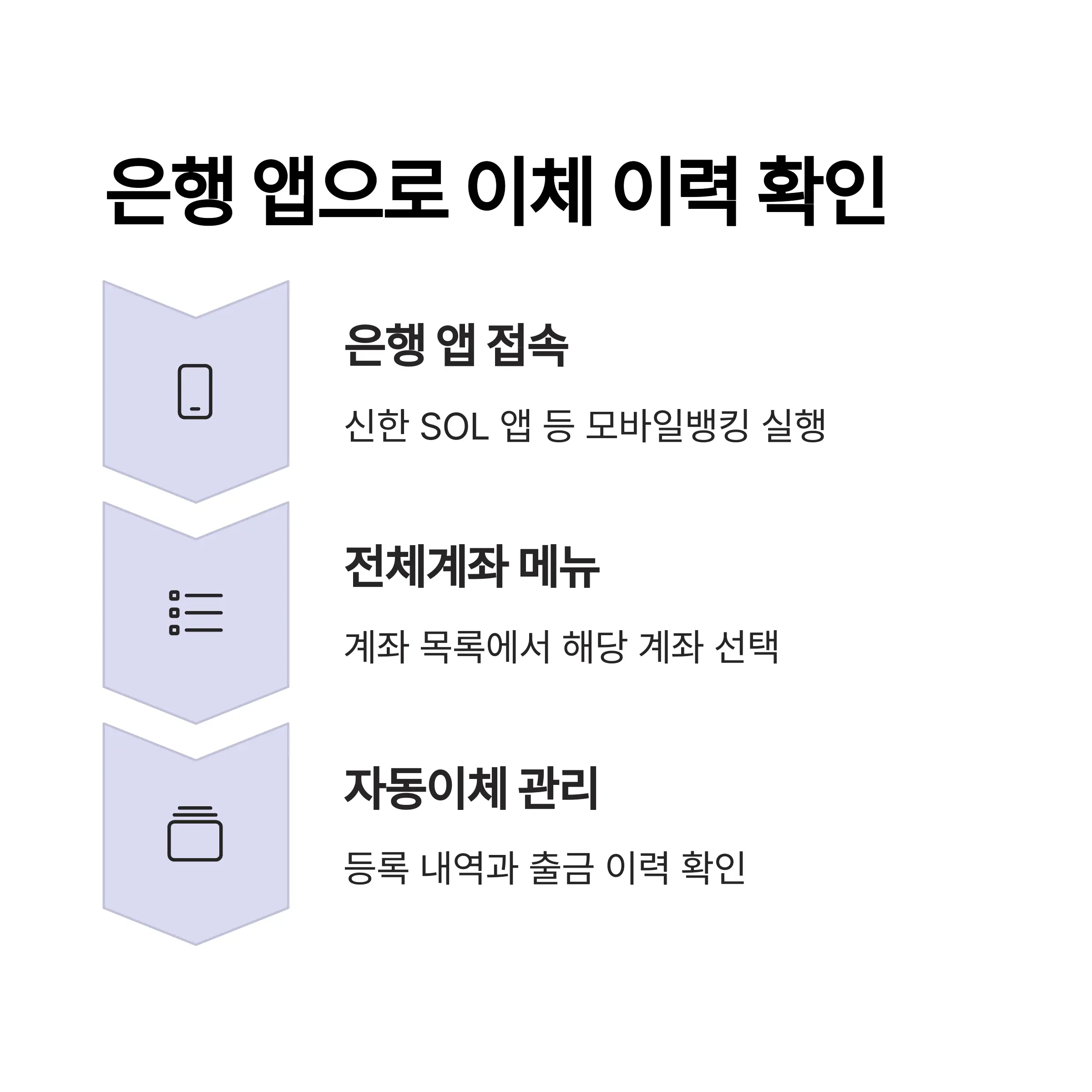 신한은행 기준으로는 [신한 SOL 앱 → 전체계좌 → 자동이체 관리] 메뉴에서 자동이체 등록 내역과 출금 이력을 조회할 수 있습니다.