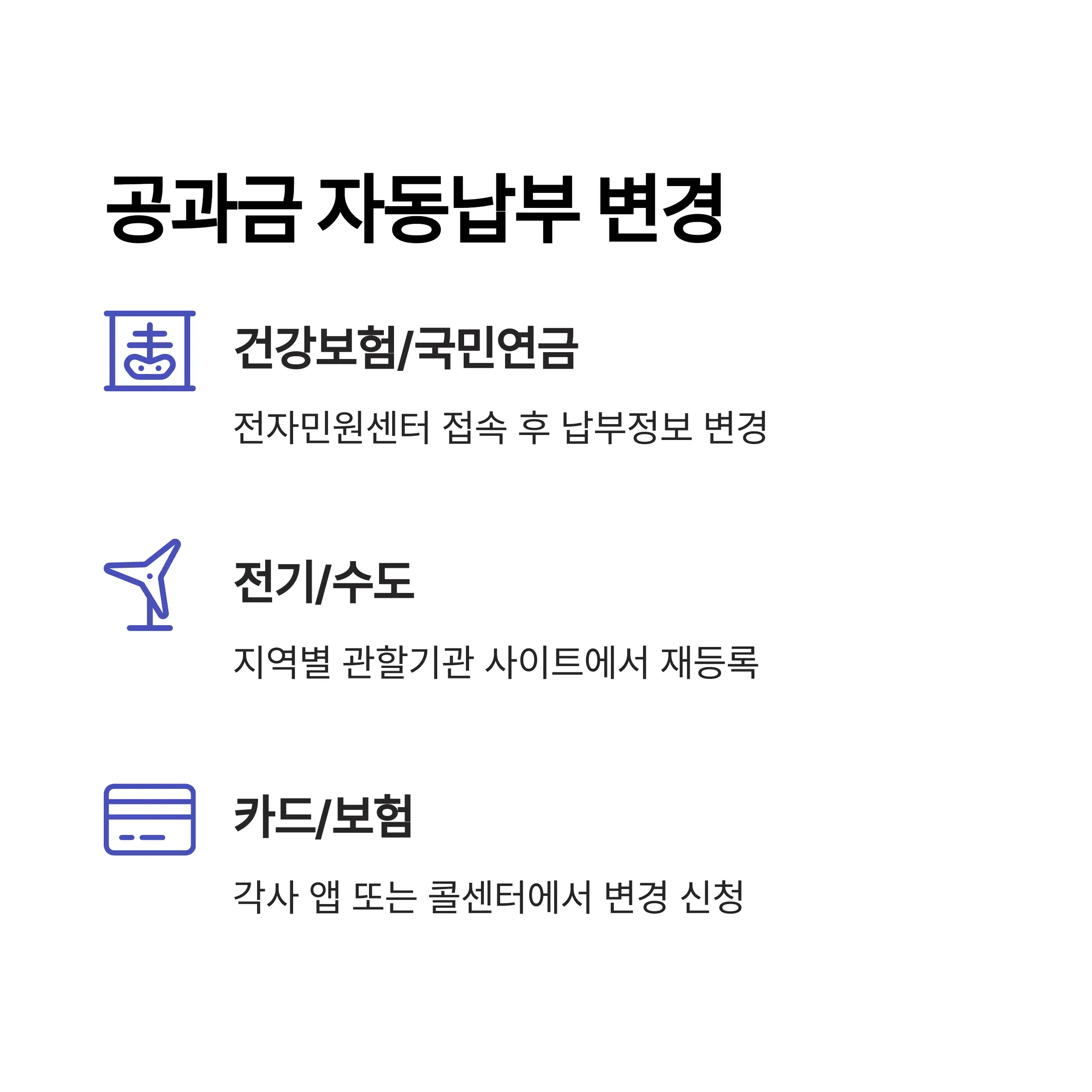 - 공과금(전기, 수도 등): 지역별 관할기관 또는 지자체 사이트 → 자동납부 신청 메뉴에서 재등록 필요