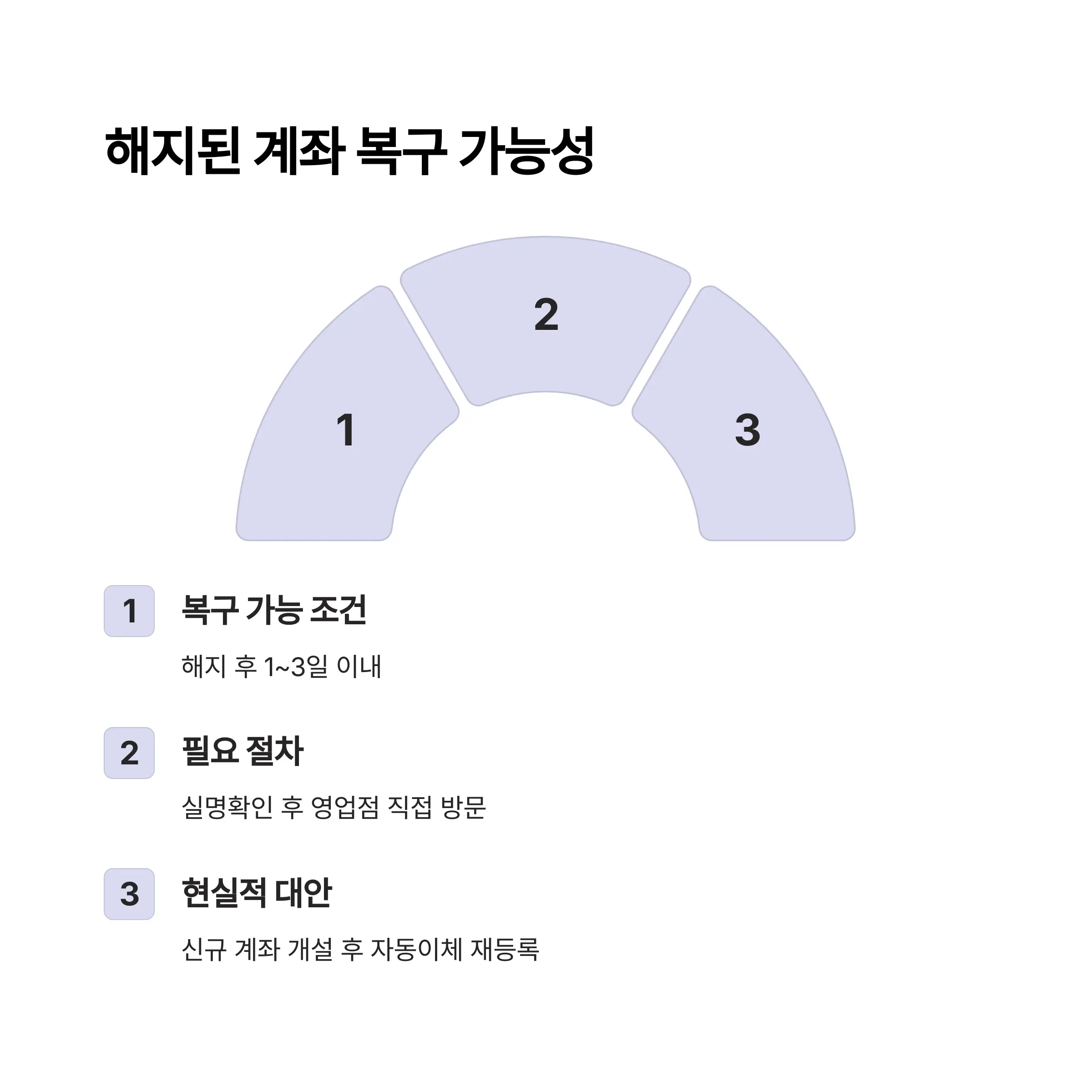 이 경우, 해지 계좌 복구 가능 여부는 은행 지점에 직접 문의하는 것이 가장 빠릅니다. 신한은행을 포함한 주요 은행들은 최근에는 복구보다는 ‘신규 계좌 개설 유도’ 쪽으로 가이드하고 있기 때문에, 실질적으로는 새 계좌로의 자동이체 재등록이 현실적인 방법입니다.