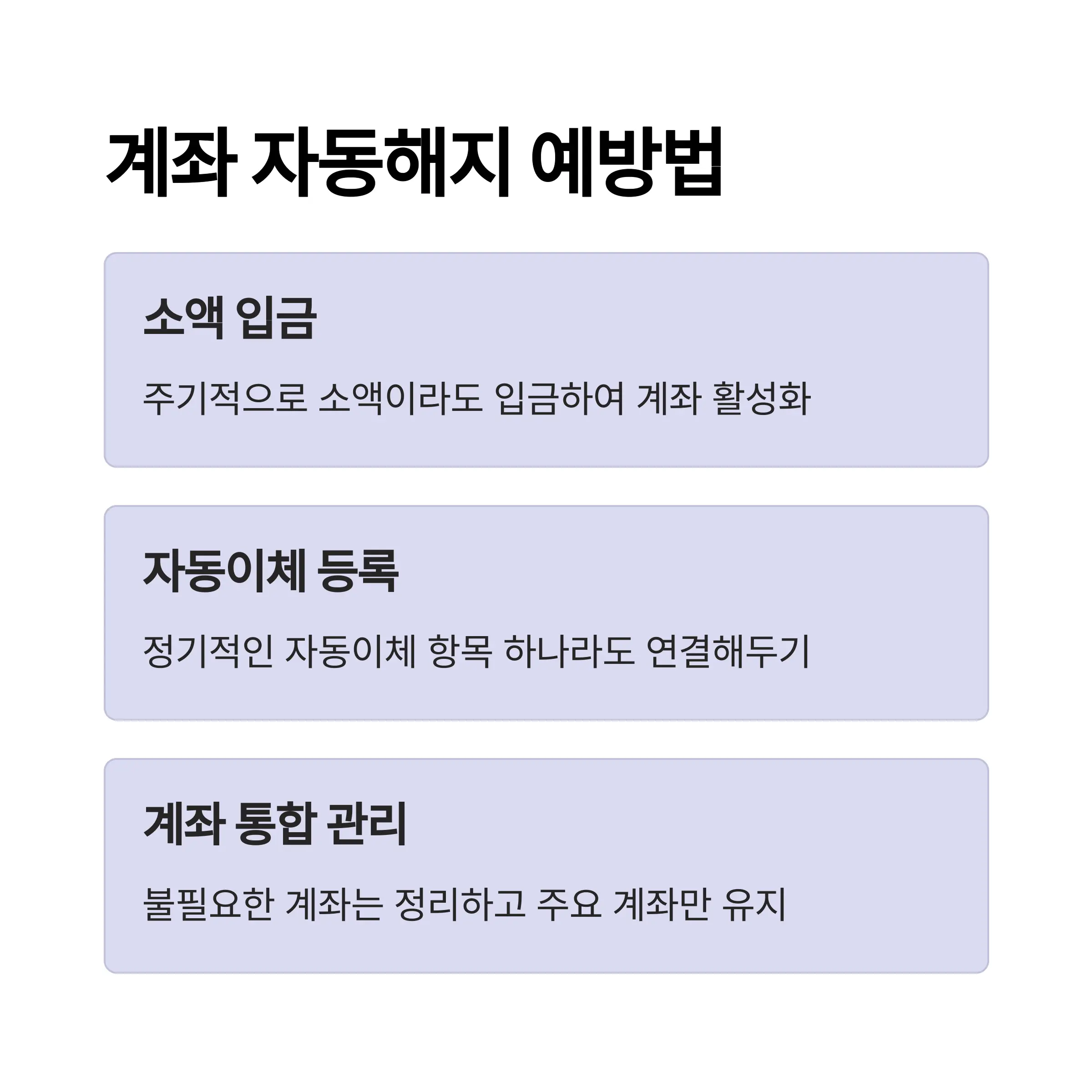 - 해지 전: 자주 쓰지 않는 계좌라도 소액 입금이나 자동이체 등록으로 유지