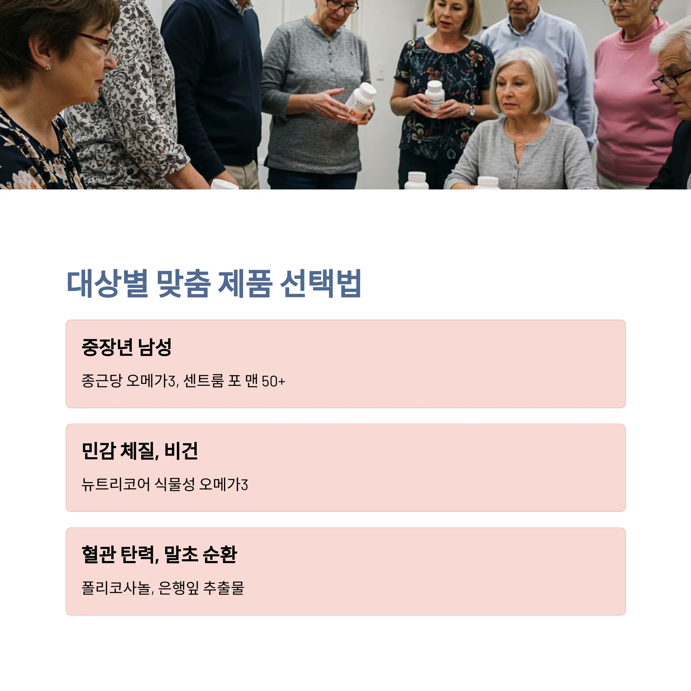 혈행개선제는 누구에게나 똑같은 효과를 주지 않아요. 오메가3가 잘 맞는 사람도 있고, 은행잎이나 폴리코사놀이 더 효과적인 분도 있죠. 그래서 중요한 건 “유명한 브랜드”가 아니라, 내 몸과 상황에 맞는 제품을 고르는 것이에요.