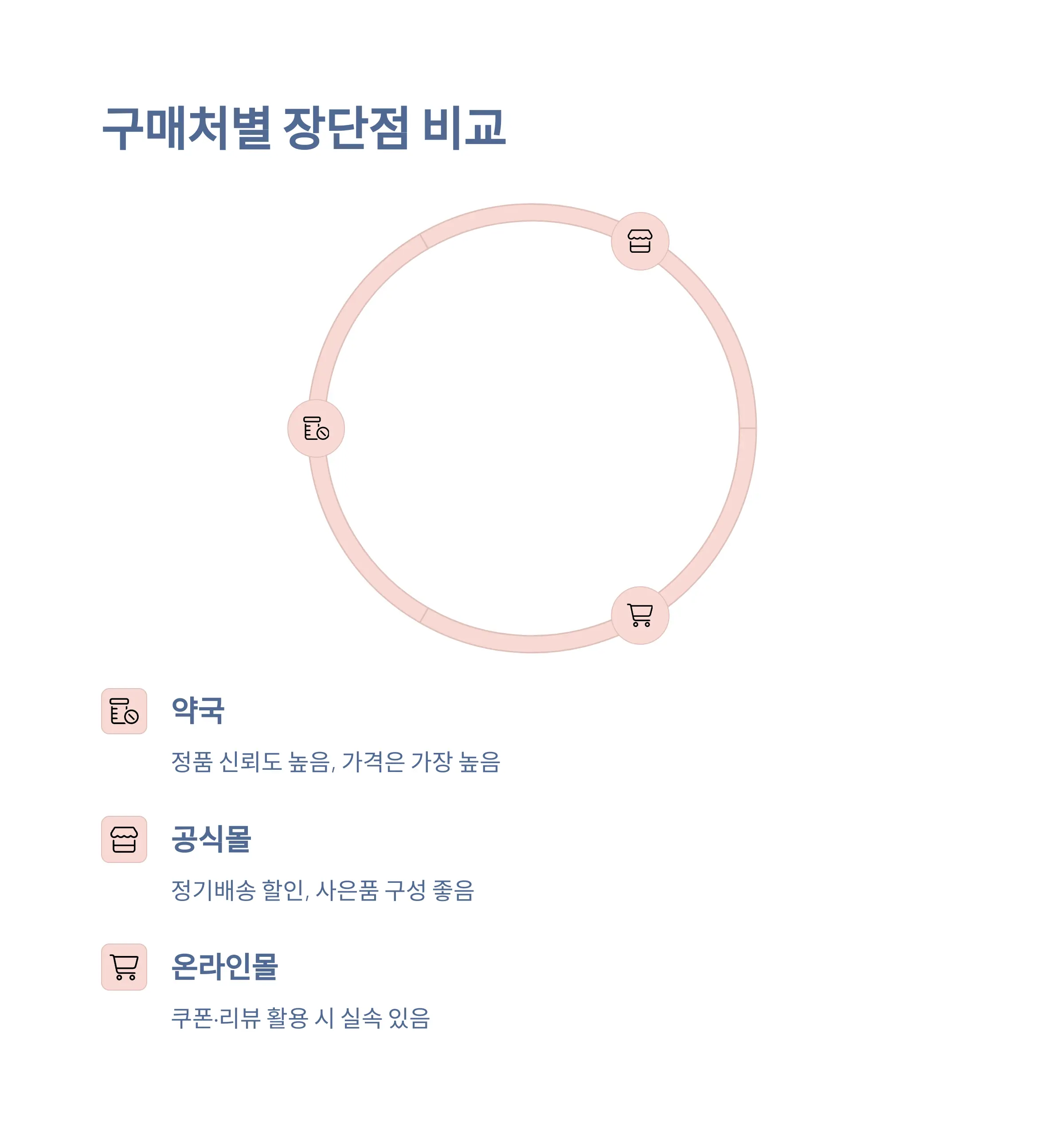 처음 복용하시는 분이라면 약국이나 공식몰에서 구매하는 것이 마음이 놓일 수 있고, 이후 재구매는 온라인몰을 활용하는 것이 경제적이에요.