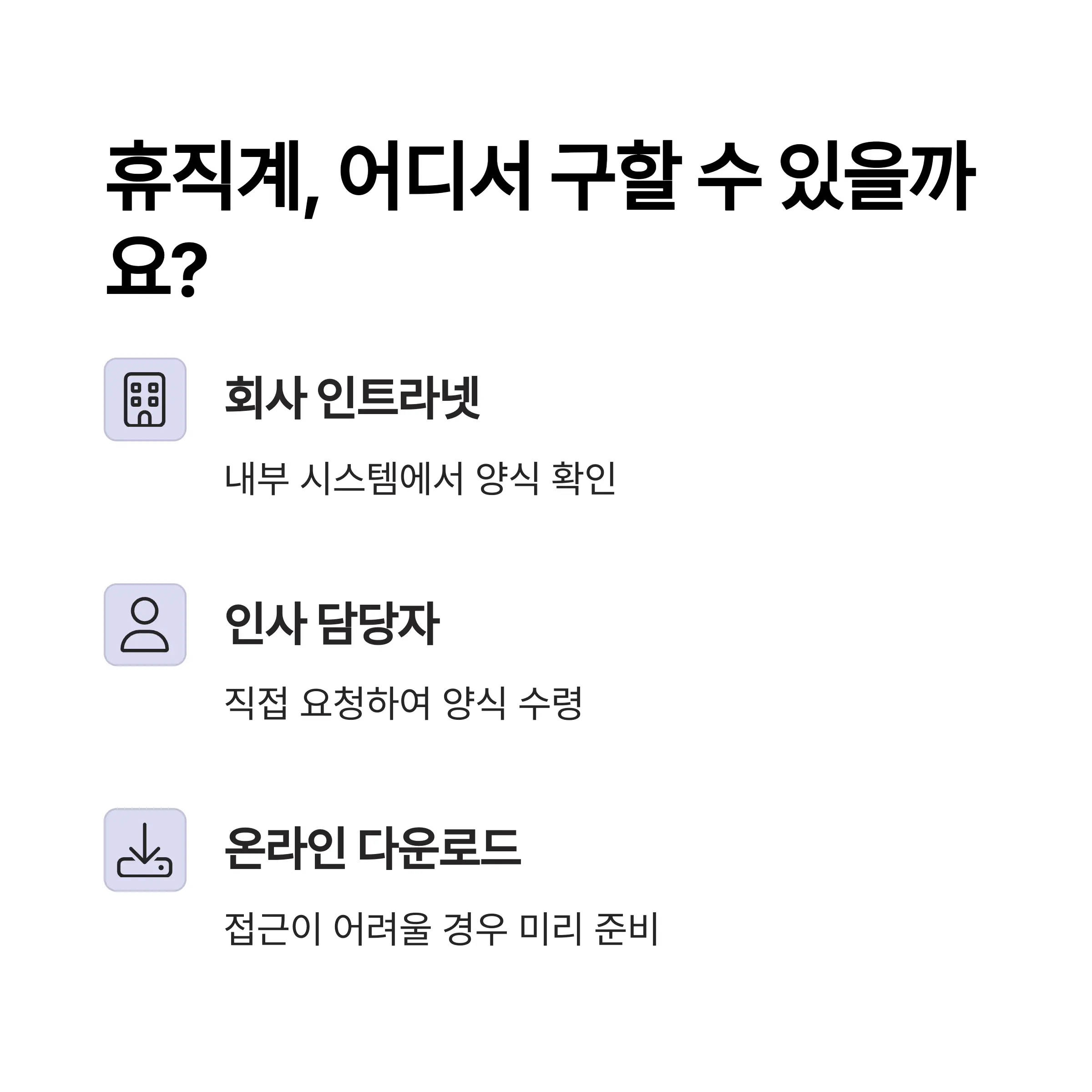 휴직계는 보통 회사 내부 인트라넷이나 인사 담당자에게 요청하면 받을 수 있습니다. 하지만 인트라넷 접근이 어렵거나 양식이 준비되지 않은 경우, 온라인에서 미리 준비해두는 것이 좋습니다.
