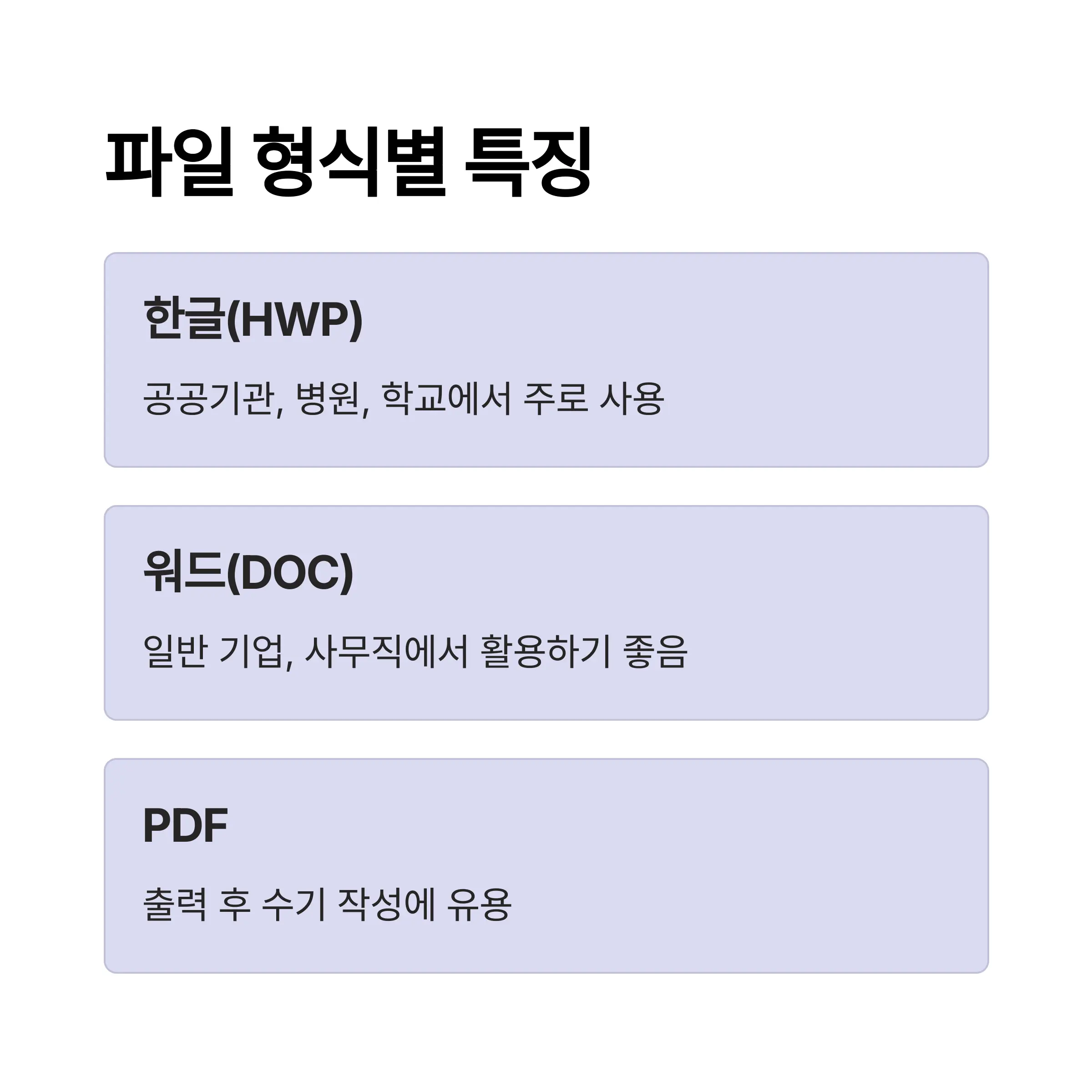 - 한글 양식(HWP): 국내 공공기관이나 병원, 학교 등에서 주로 사용